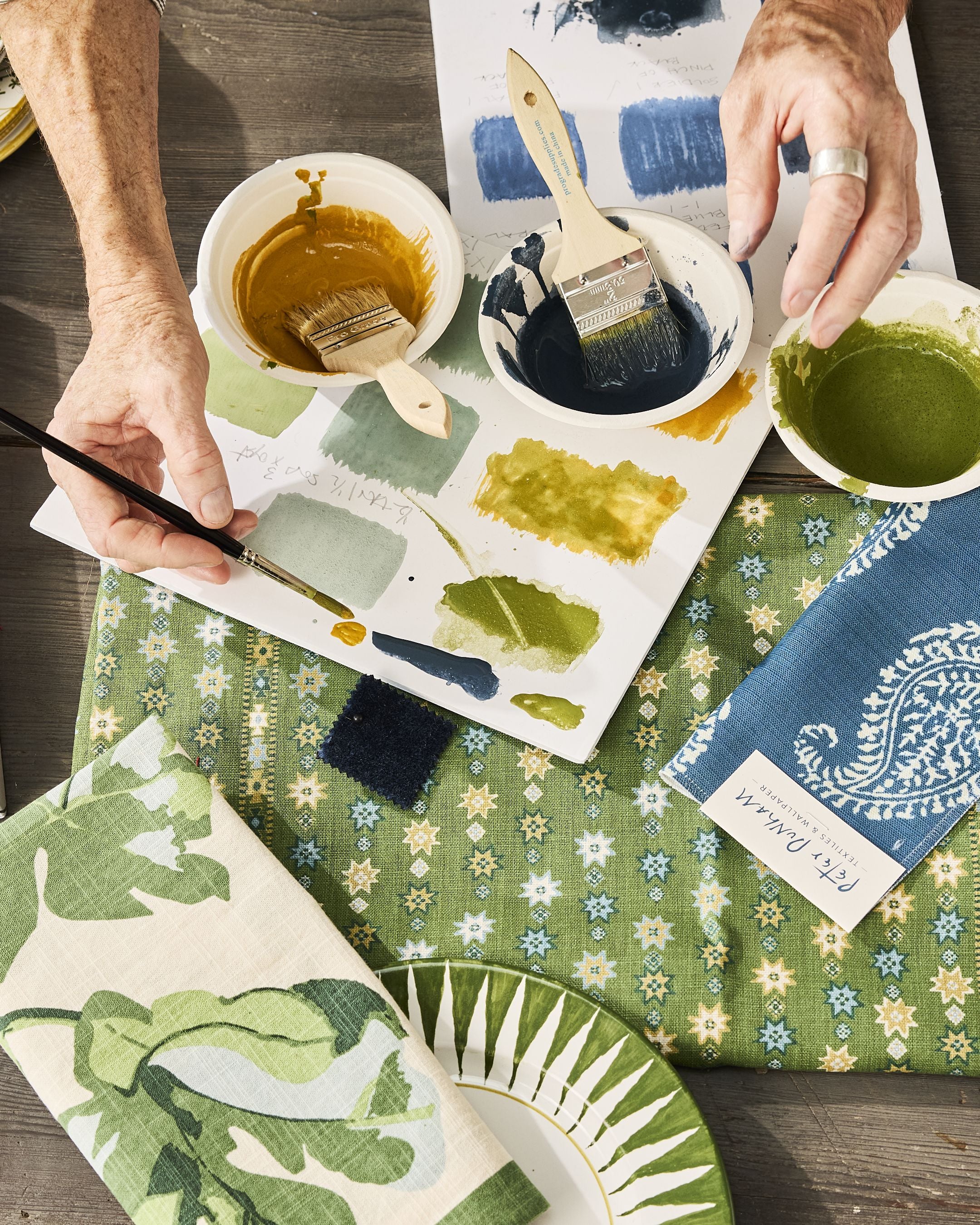 The collection reflects Peter Dunham’s fearless use of pattern and color—shaped by his travels, European roots, and love of handcrafted design.
