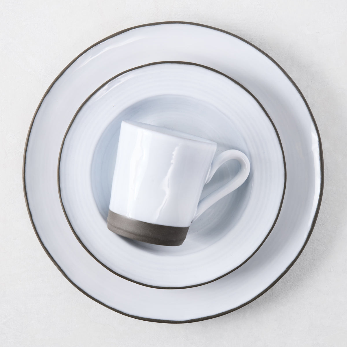The Smoke Stoneware Collection pairs an organic silhouette with a modern dark rim for a clean, elevated contrast. Handcrafted in Portugal, each piece has a soft white glaze and a subtly irregular edge, finished with a deep charcoal border that gives the collection its graphic, contemporary look. It’s a refined balance of classic stoneware and modern design.