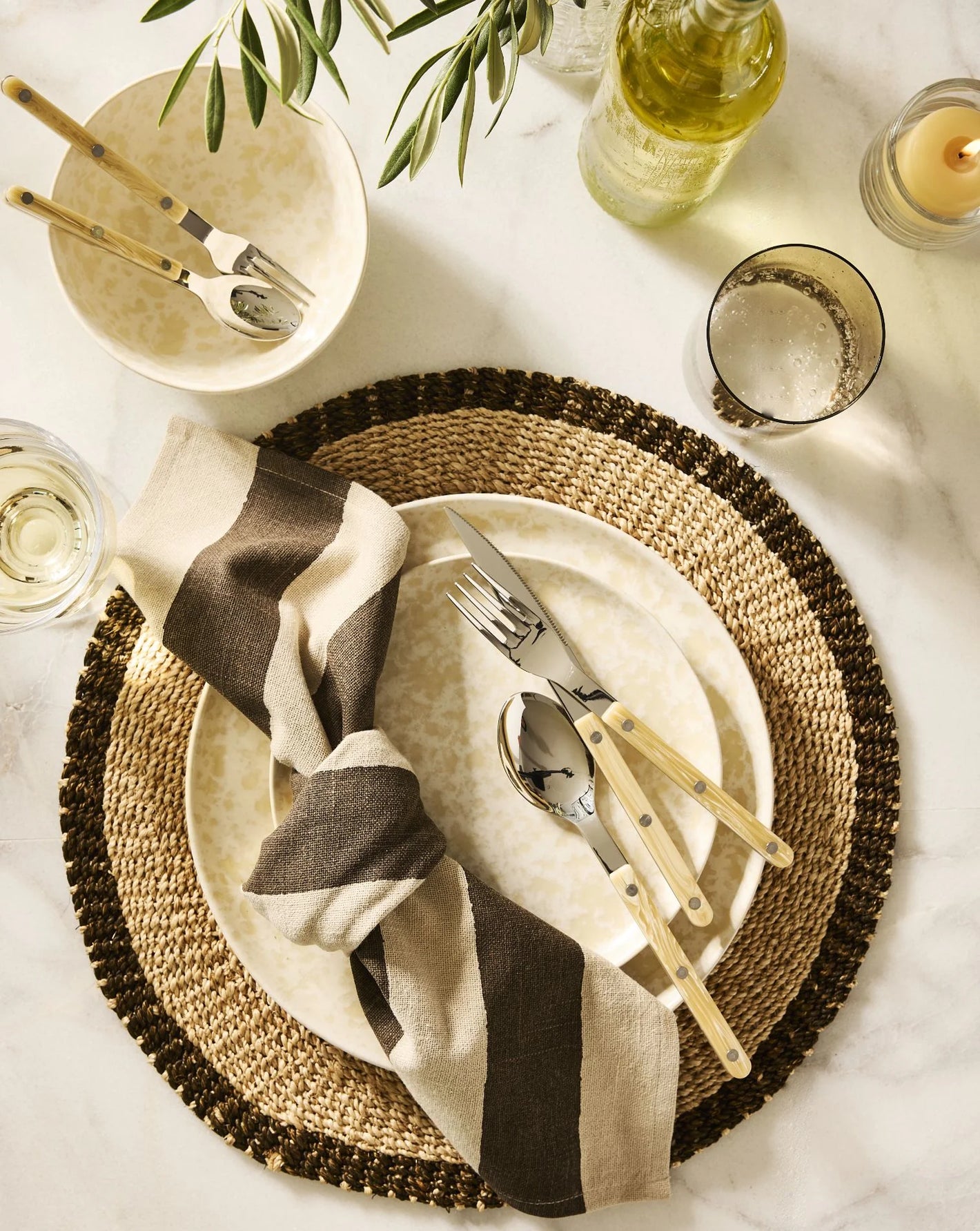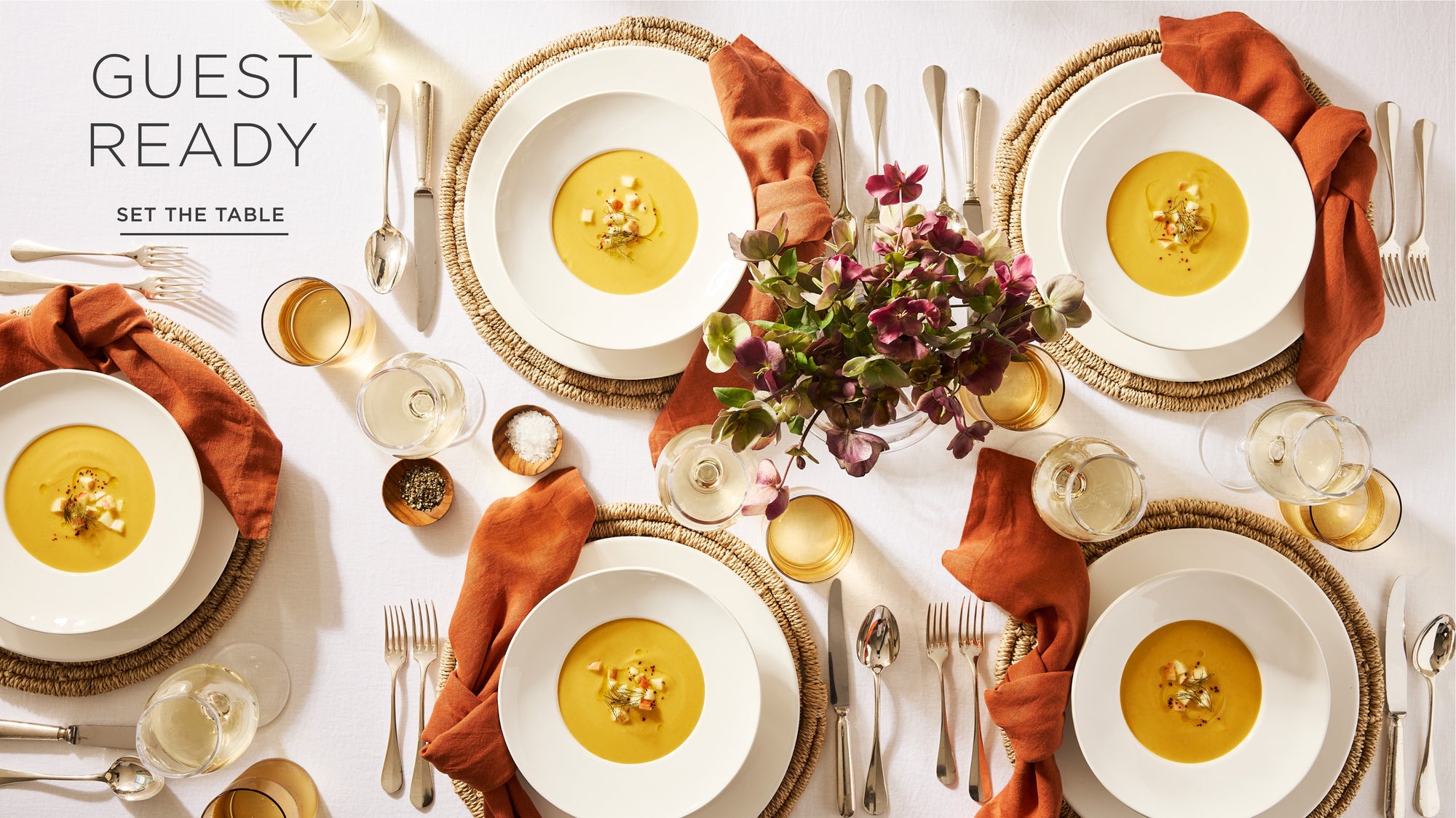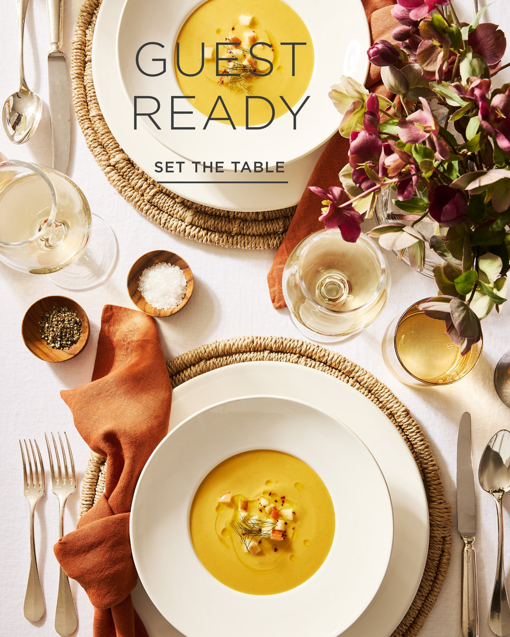 Set the table with thoughtfully crafted dinnerware, flatware, and linen napkins for a warm and inviting Thanksgiving gathering.
