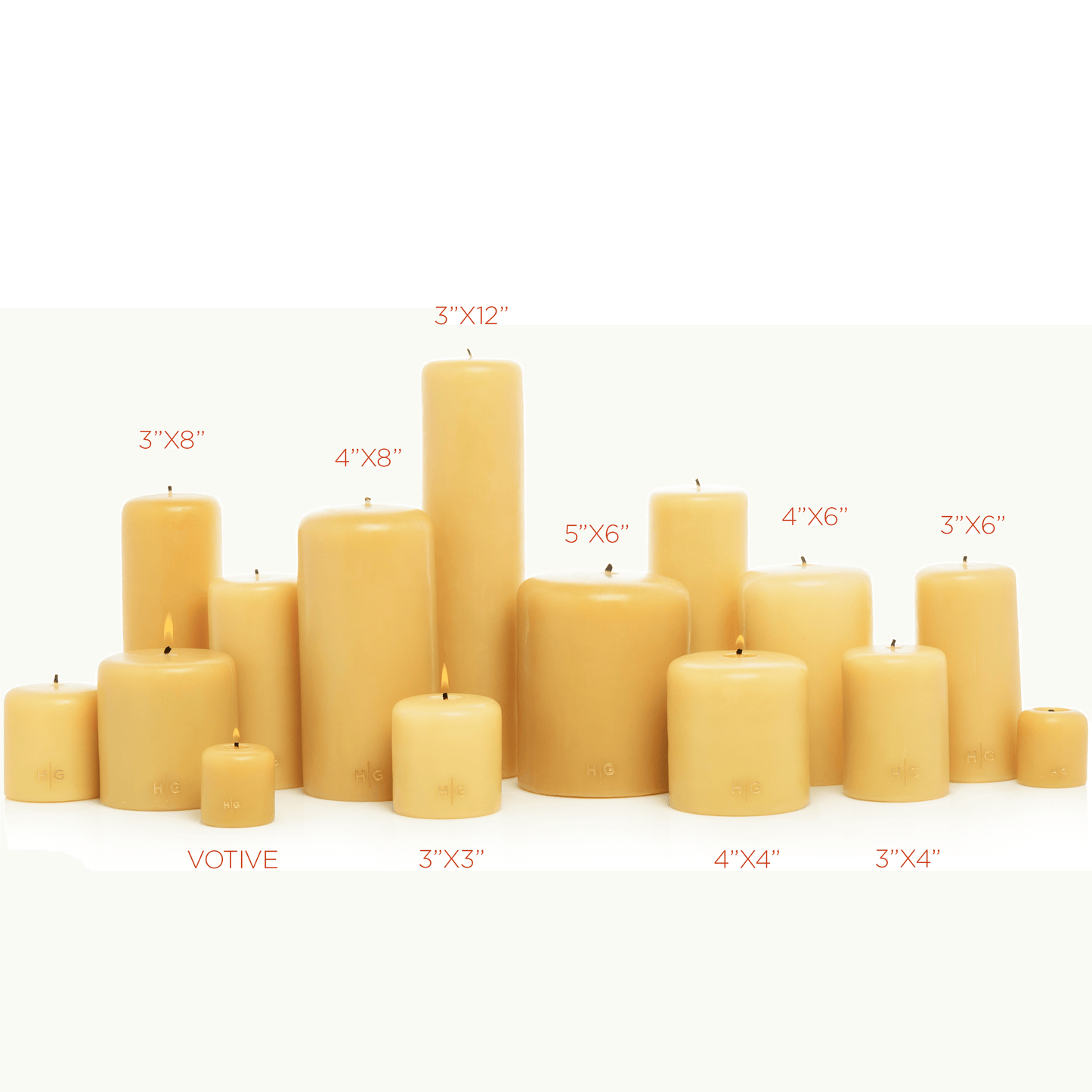 Exclusively Hudson Grace, our hand-dipped 3"x4" Amber pillar candle is made from all-natural paraffin and its rich amber color comes from natural tree resin. The pillar is unscented, making it ideal for dining, and hand embossed with a gold HG logo. The oversized cotton wick provides a generous flame.