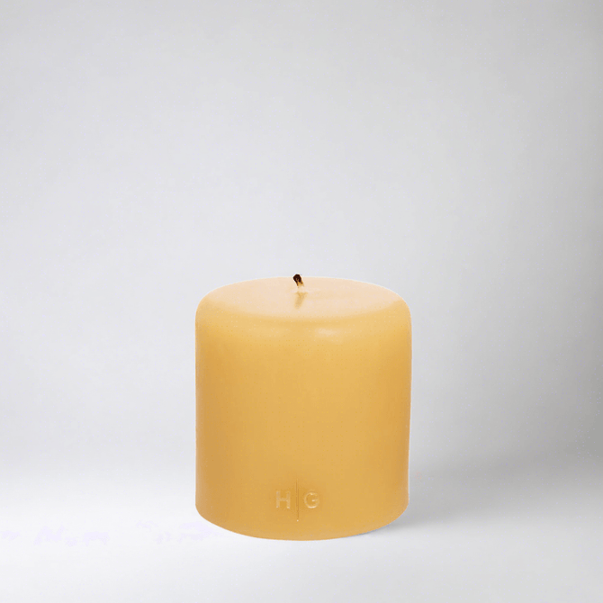 Exclusively Hudson Grace, our hand-dipped 4"x4"Amber pillar candle is made from all-natural paraffin and its rich amber color comes from natural tree resin. The pillar is unscented, making it ideal for dining, and hand embossed with a gold HG logo. The oversized cotton wick provides a generous flame.