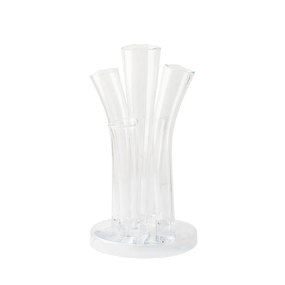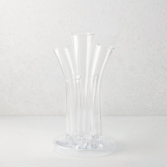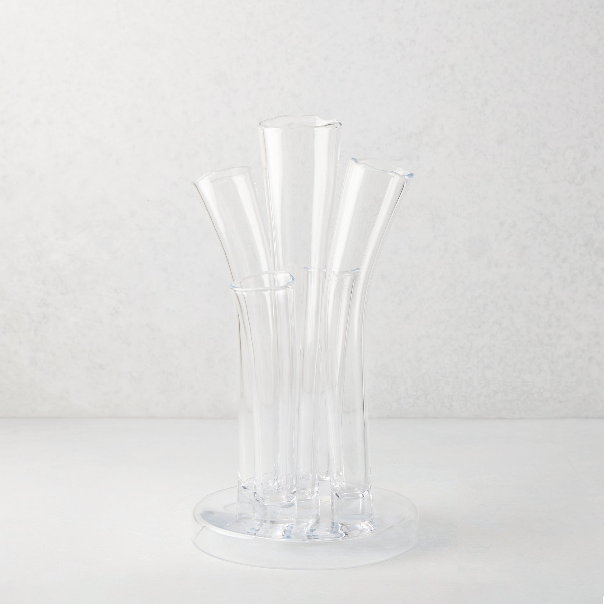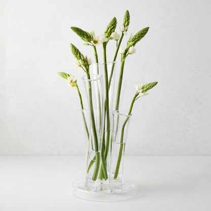Beautifully handmade of thick clear glass. The Angelina Vase is all about creating a dramatic display in any room on any surface. The stair-step fluted tubes are individually and meticulously made by hand and attached to a circular base. Surprising by itself or with seasonal stems, the Angelina Vase makes a bold statement. Designed in Belgium, Handmade in Poland.