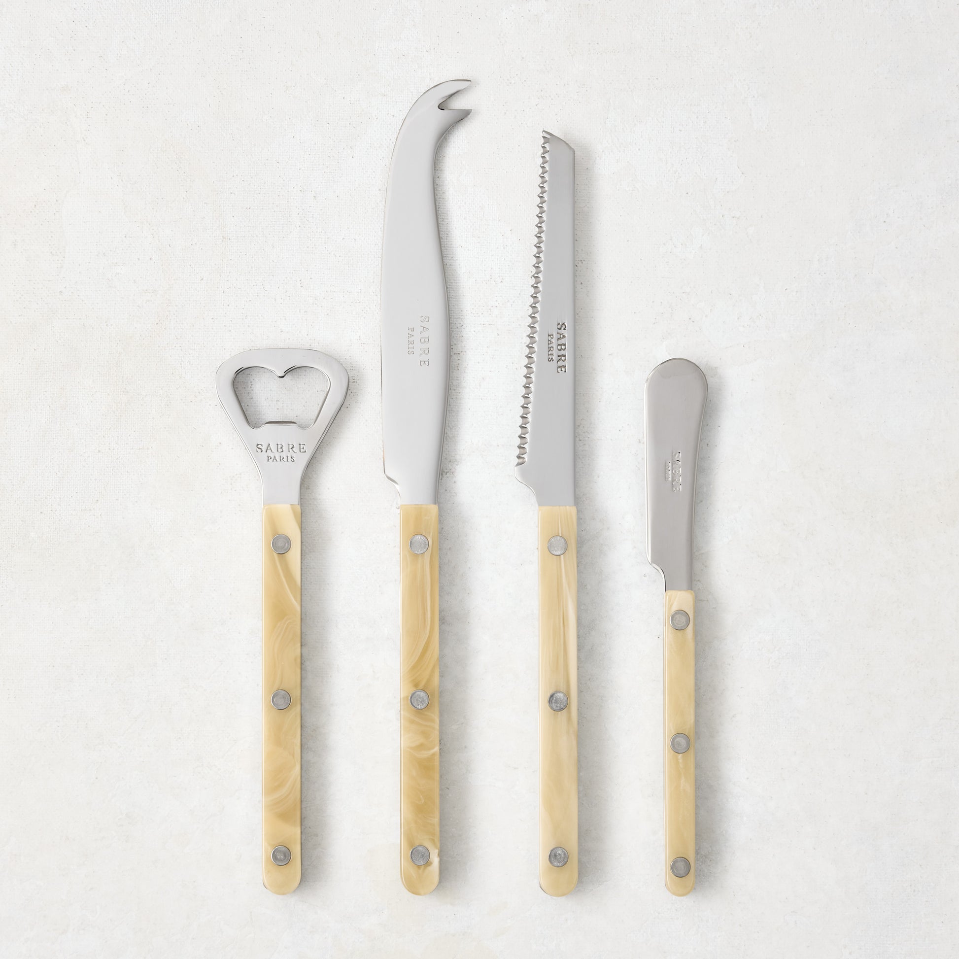 Embrace the world of appetizers with the Paris Bistro Aperitif Set. Including a bottle opener, a tomato knife, a cheese knife, and a butter spreader. Perfect for anything from charcuterie boards to a baguette and butter, this set is an essential addition to any kitchen.