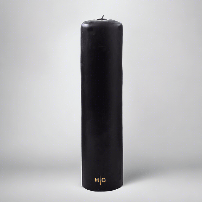 Exclusively Hudson Grace, our hand-dipped 3"x12" Black pillar candle is made from all-natural paraffin and amber tree resin. The candle has a black exterior over an amber interior. The pillar is unscented, making it ideal for dining, and hand embossed with a gold HG logo. The oversized cotton wick provides a generous flame. Always trim the wick before burning the candle.