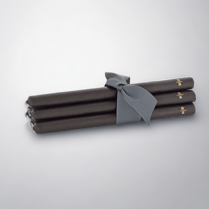 Exclusively Hudson Grace. Our hand-dipped candle is made from all-natural paraffin and amber tree resin. The 12" taper is unscented, making it ideal for dining. Hand embossed with a gold HG logo. Oversized cotton wick provides a generous flame.