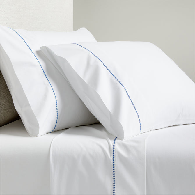 Bold and classic, our Portuguese Percale Blue Diamond Collection takes a cue from the bedding we found in the finest European boutiques and hotels. The Blue Diamond Percale Sheet Set is cool and crisp, softens with wash and use, and is the perfect way to tuck into luxury every night. It is woven from extra-long staple cotton in a 310-thread-count percale. The tailoring and blue diamond detail in a sophisticated color palette make this a versatile collection that layers easily with other bedding and interior style.