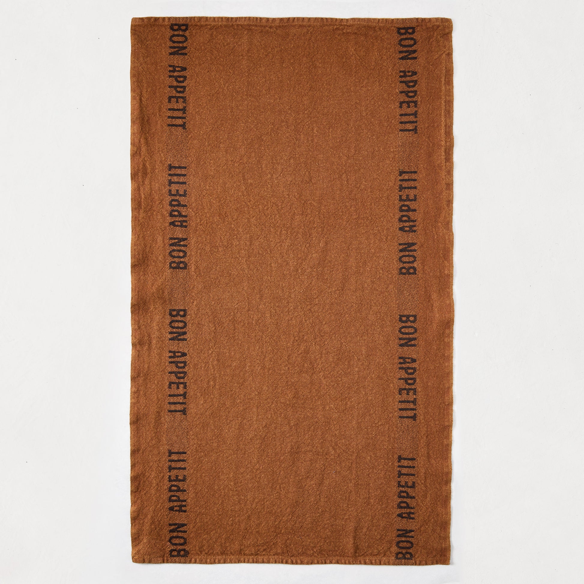 Elevate your kitchen with the oversized Black "Bon Appetit" Brown Linen Hand Towel. Made from 100% linen, and pre-washed for ideal softness, this set of 2 towels is designed for function and flair. Woven in a dark brown with black lettering, these towels are highly absorbent, lint-free, and effortlessly stylish.