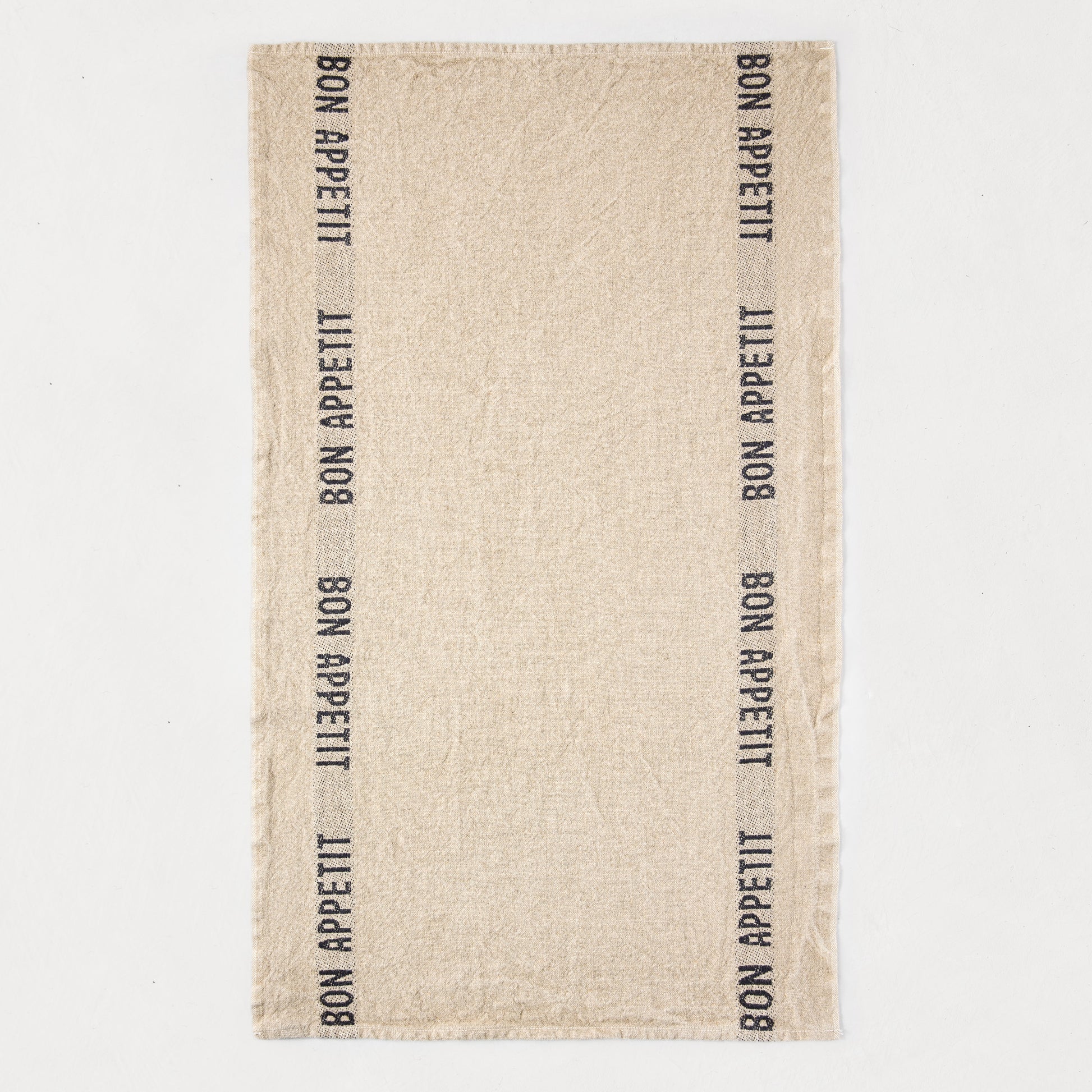 Elevate your kitchen with the oversized Black "Bon Appetit" Khaki Linen Hand Towel. Made from 100% linen, and pre-washed for ideal softness, this set of 2 towels is designed for function and flair. Woven in a classic khaki with black lettering, these towels are highly absorbent, lint-free, and effortlessly stylish.