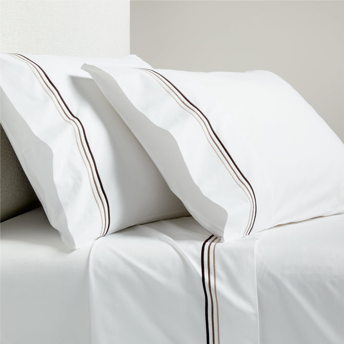 Refined and timeless, our Portuguese-made Brown Triple Stitch Percale Sheet Sets take a cue from the bedding we found in the finest European boutiques and hotels. This collection is classically modern and elegantly simple, woven from extra-long staple cotton in a 310-thread-count percale. The crisp tailoring and thin, neutral-toned triple stitch edging make this a versatile sheeting collection that layers easily with other coverlets, duvets, and shams.