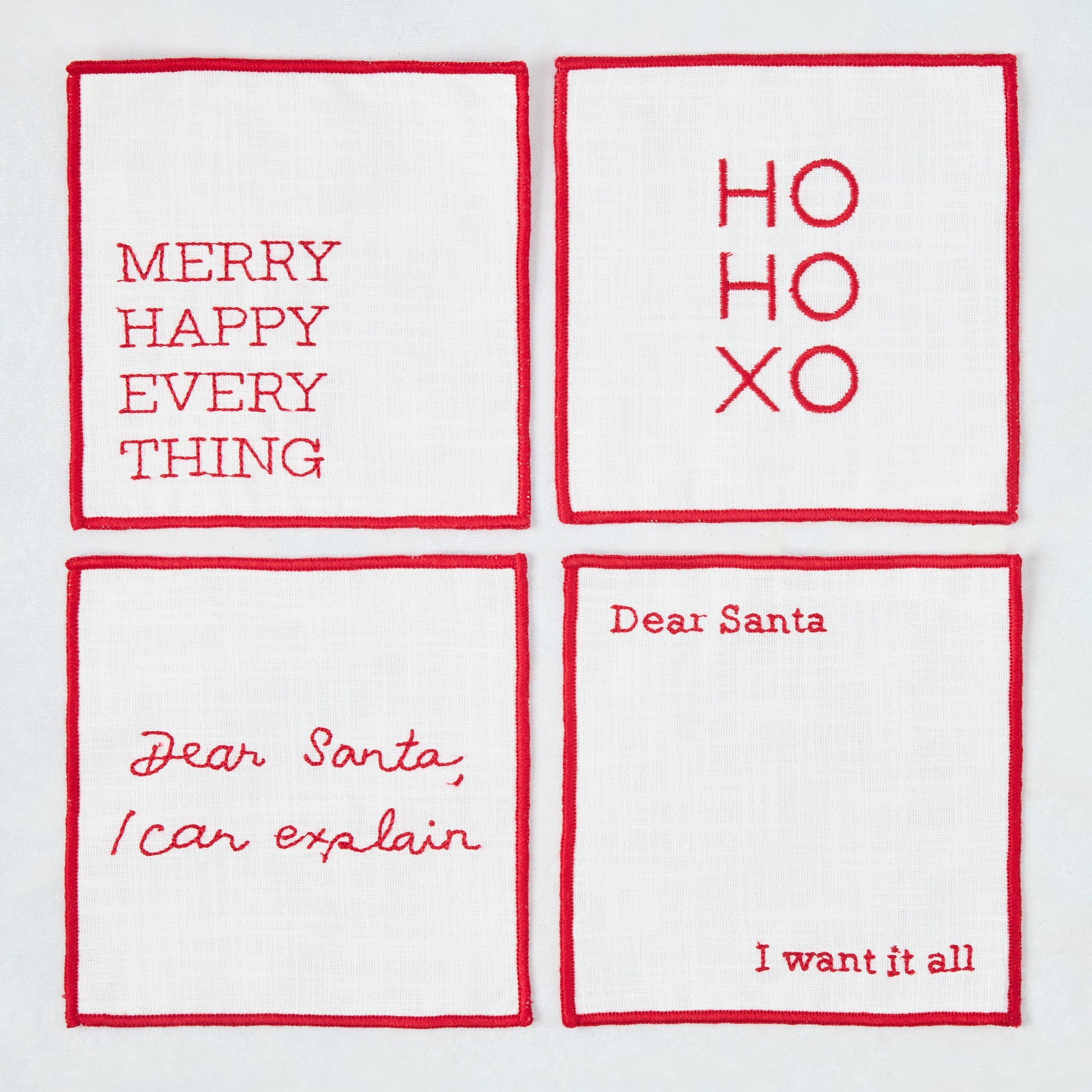 Add a holiday flare to your bar with the "Christmas Embroidered Coasters" Coasters. With four red embroidered Christmas-themed coasters, this set is perfect for small gatherings. Designs include "Merry Happy Everything," "Ho Ho Xo," "Dear Santa, I can Explain," and "Dear Santa, I want it all"