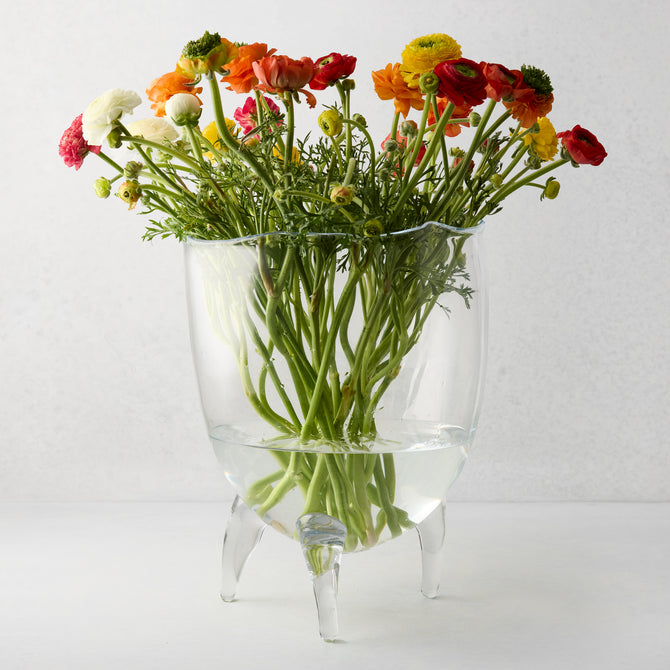 These versatile vases are made of mouth-blown glass in a factory in Belgium. These long-standing practice makes each piece unique with slight variations in height and size. When the glass is hot, each piece is cut with scissors which creates the stunning warped edge.