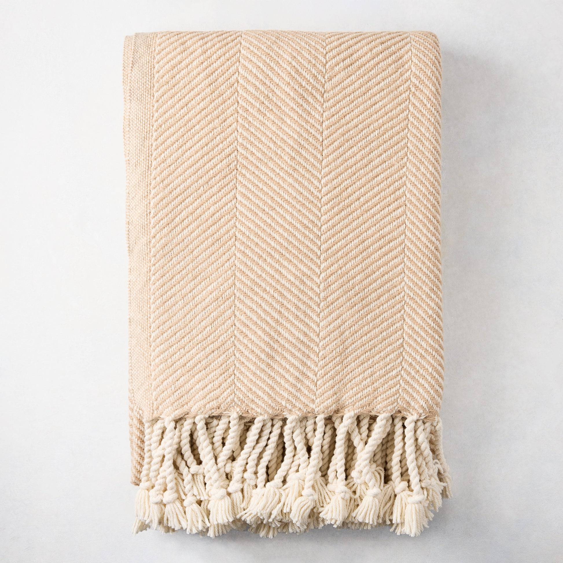 The Khaki Chevron Cotton Throw Blanket is thick, cozy, and features an oversized chevron pattern and thick rope fringe. The hem of this blanket is self-finished, and can only be produced on an antique loom. Whether hung over a chair in your living room, or over the foot of a bed, this blanket is the perfect gift to give or receive.