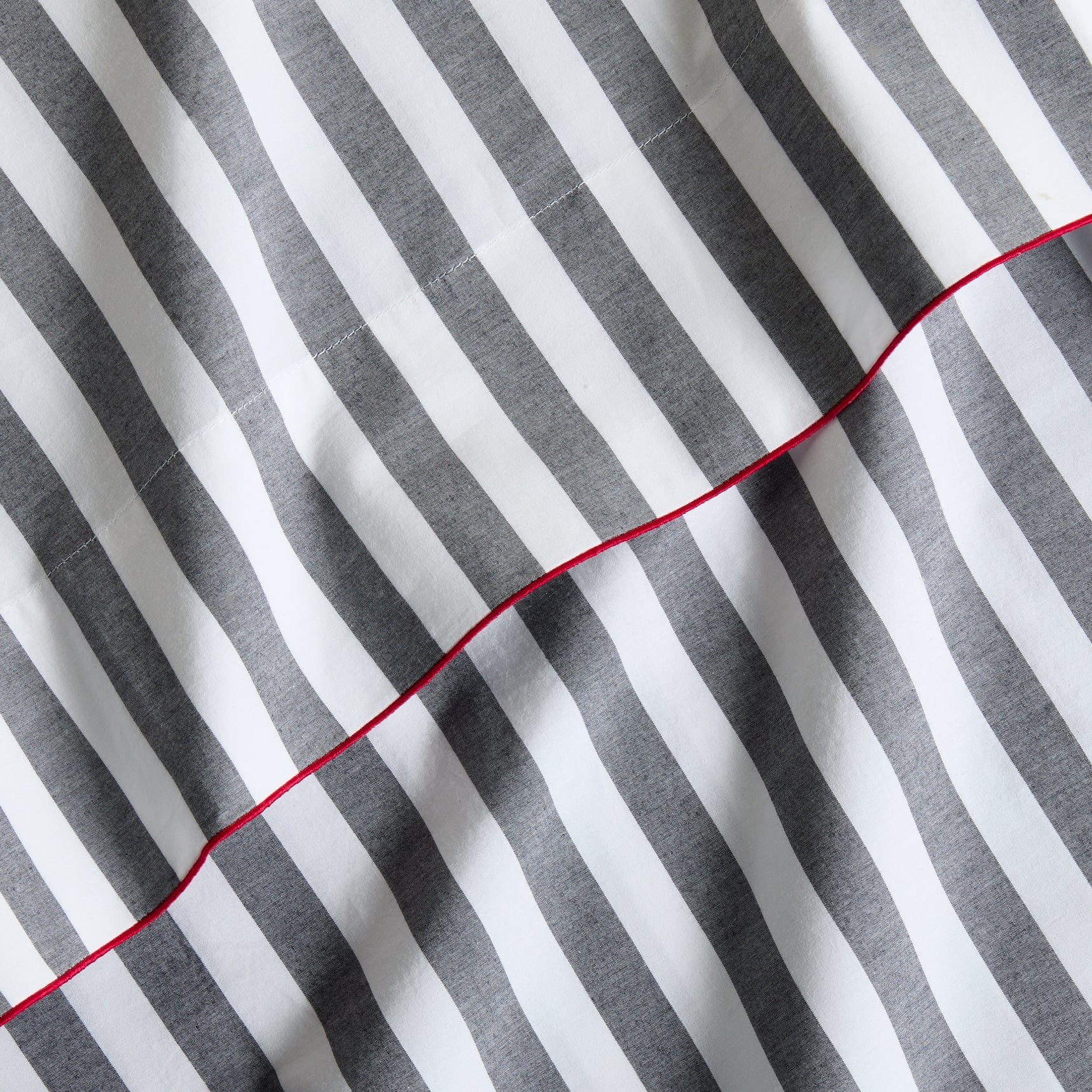 The Diane Keaton + Hudson Grace Yarn Dyed Striped Percale Sheet Set with Red Trim will bring a a modern pop to your bedroom. Made in Portugal from woven percale with a 210 thread count, the crisp cotton ensures clean lines and an elegant feel. The embroidered red trim on the flat sheet and pillowcases adds a pop of color that elevates any bed. Available in Queen and King sizes.