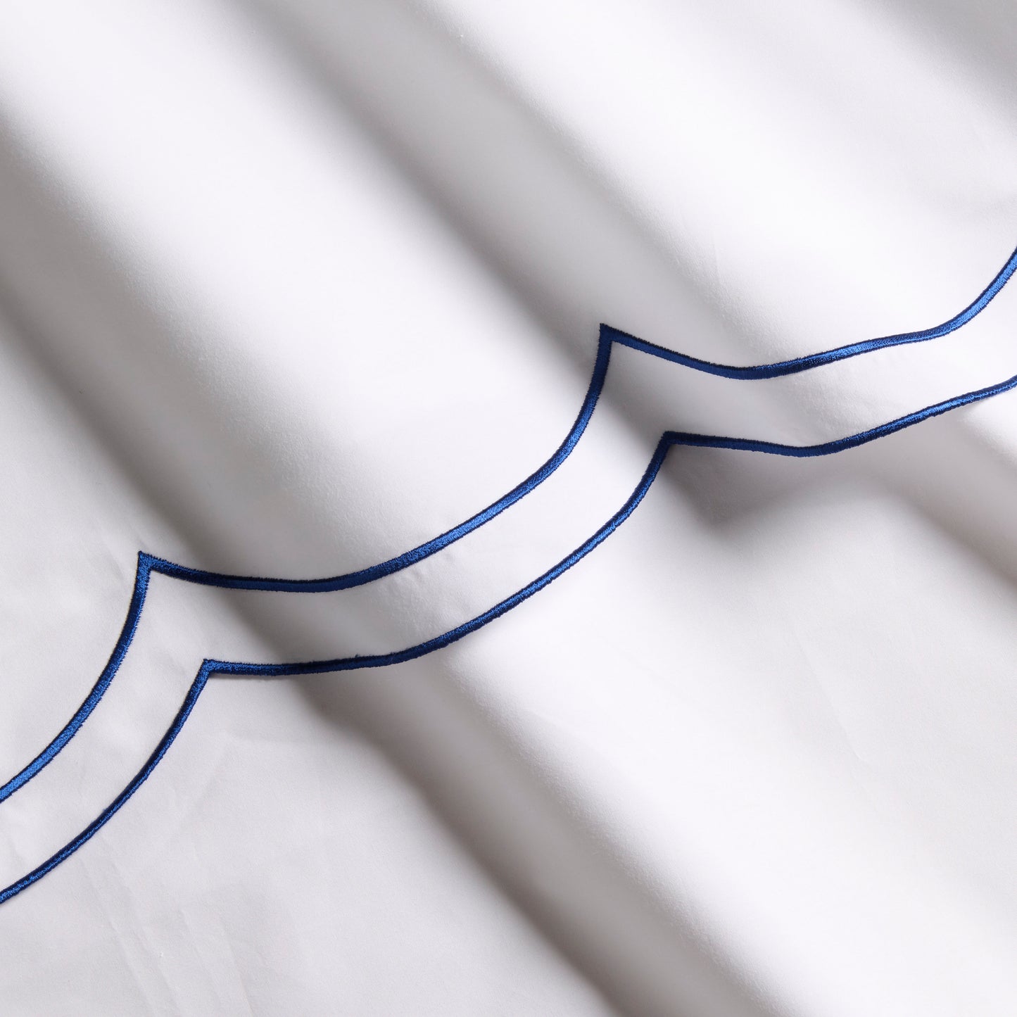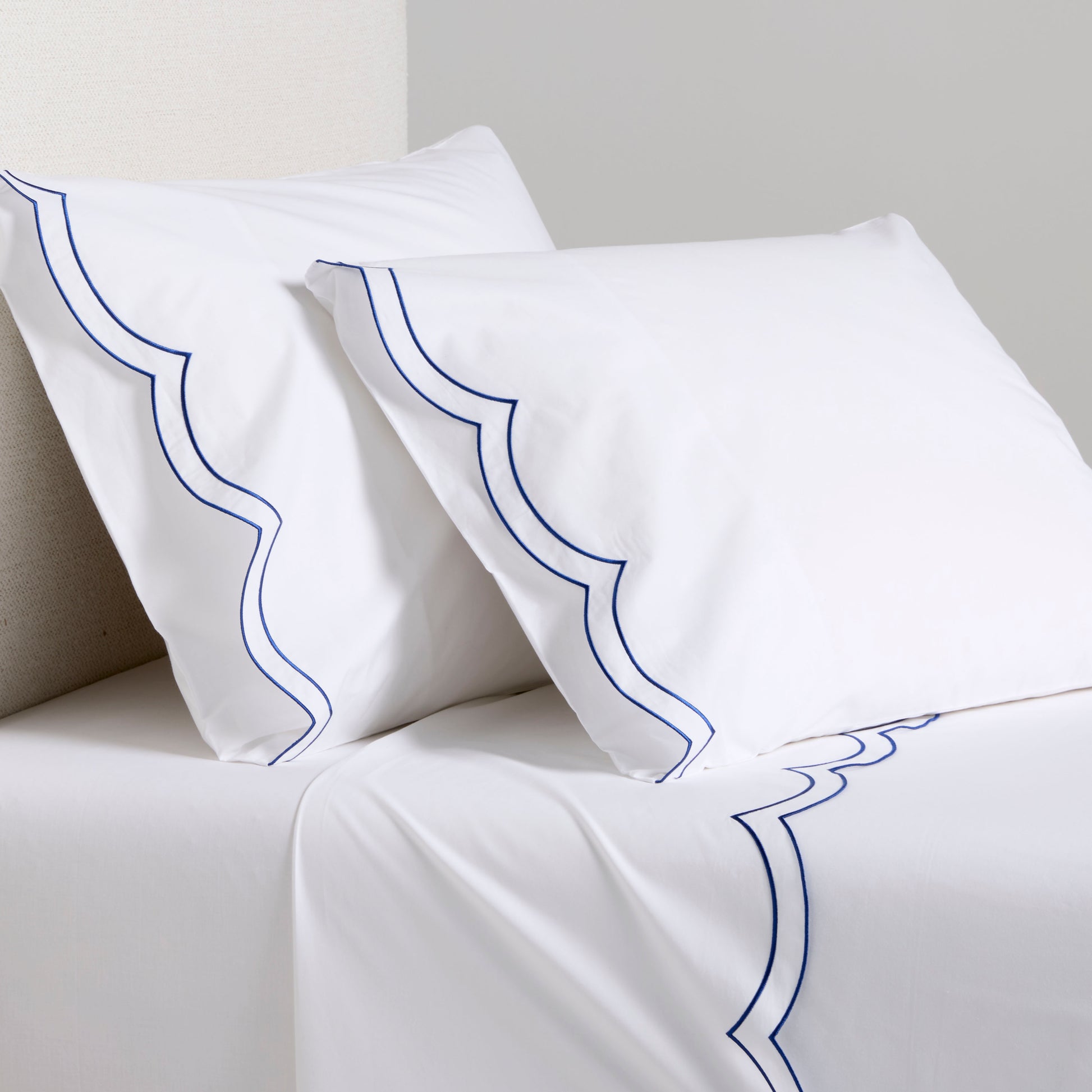 Modern yet timeless, our Blue Double Embroidered Scallop Percale Sheet Set brings a pop of color to your bed. Made in Portugal, this collection is woven from 310-thread-count percale organic cotton. Soft, inviting, and unmistakably chic, this sheet set is meant to mix and layer easily with other coverlets, duvets, and shams.