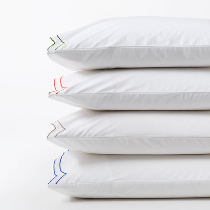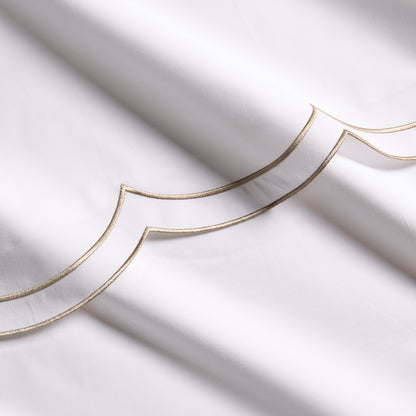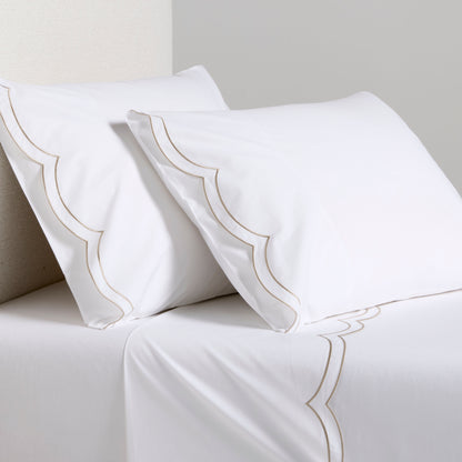 Modern yet timeless, our Khaki Double Embroidered Scallop Percale Sheet Set brings a pop of color to your bed. Made in Portugal, this collection is woven from 310-thread-count percale organic cotton. Soft, inviting, and unmistakably chic, this sheet set is meant to mix and layer easily with other coverlets, duvets, and shams.