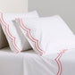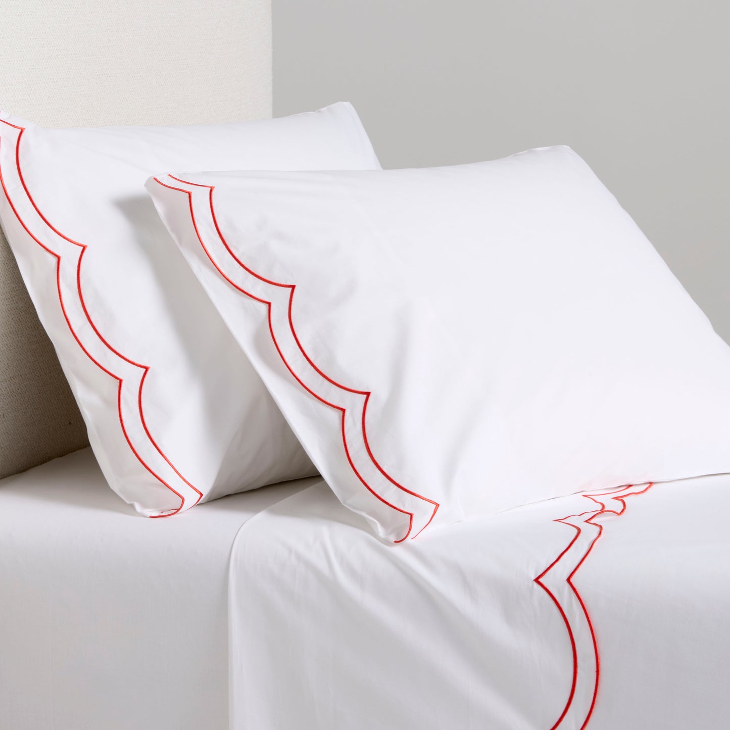 Modern yet timeless, our Orange Double Embroidered Scallop Percale Sheet Set brings a pop of color to your bed. Made in Portugal, this collection is woven from 310-thread-count percale organic cotton. Soft, inviting, and unmistakably chic, this sheet set is meant to mix and layer easily with other coverlets, duvets, and shams.