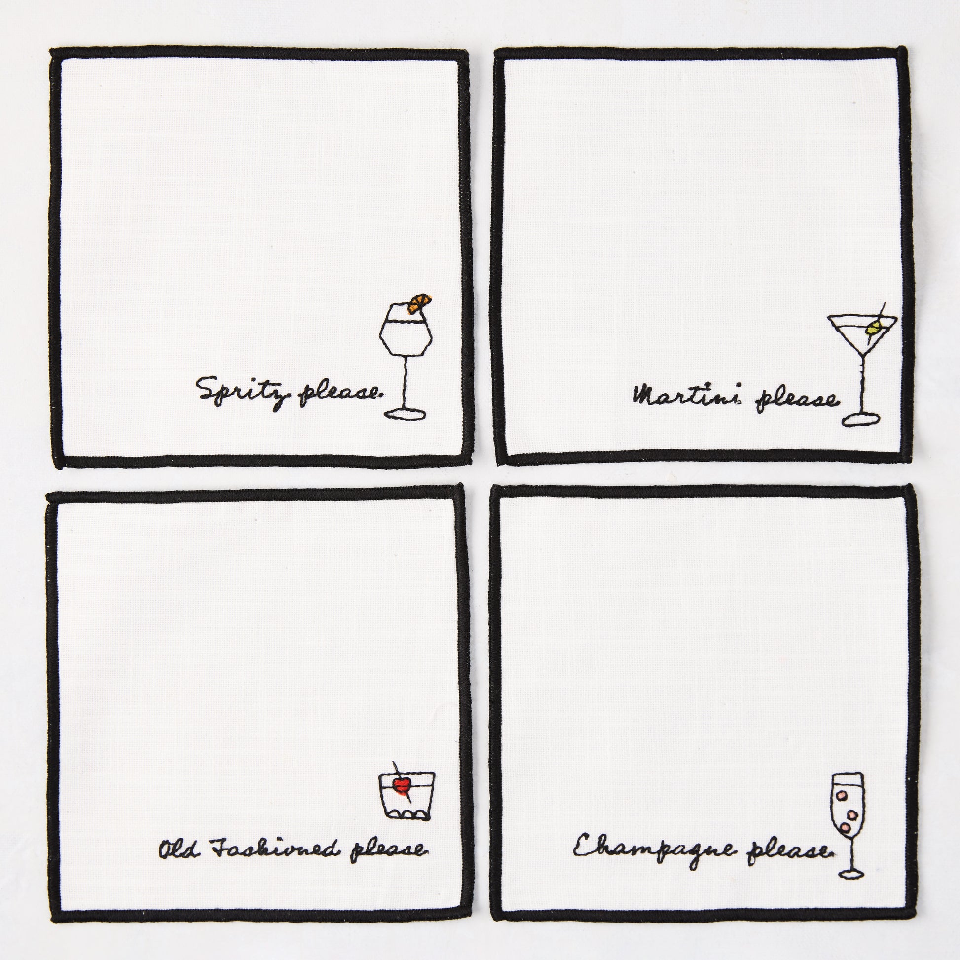 Add a fun flare to your bar with the "Drinks Please!" Coasters. With four cocktails embroidered on four coasters, this set is perfect for small gatherings. Pair each coasters with the associated drink and enjoy! Designs include a Spritz, Martini, Old Fashioned and Champagne.
