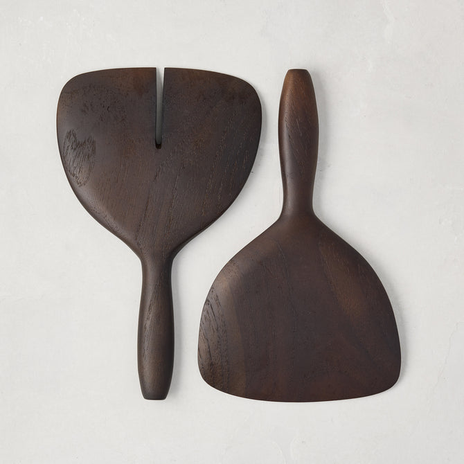 Handcrafted from sustainably sourced teak wood from protected groves in Thailand, the Ebony Teak Wide Serving Set combines natural beauty with durability. Each piece is unique due to the distinct grain variations in the wood. The short, wide design provides excellent control, making it easy to toss salads, pastas, and other dishes. Ethically crafted in small batches, these servers add an organic, modern touch to any tablescape.