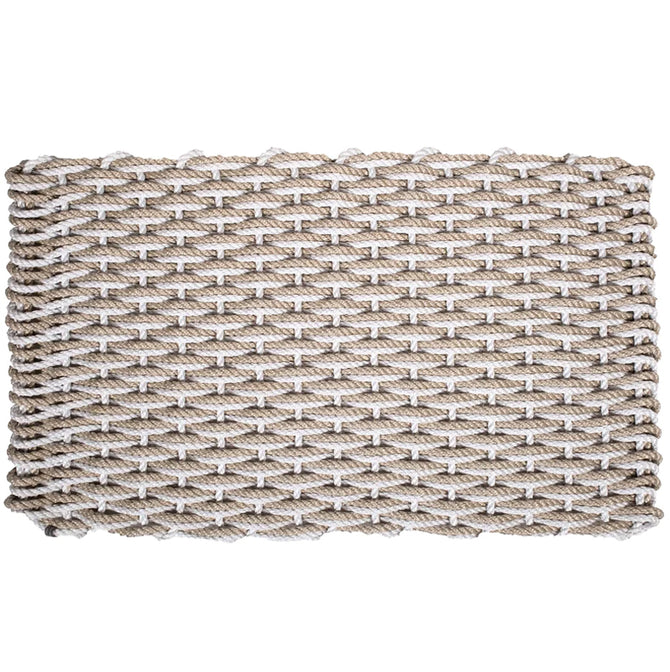 Handwoven in Maine with Maine-made rope. The Fog Grey and Sand Rope Doormat is recommended for all-weather, withstanding snow, rain, mud, wind, and sun. UV protection added to the rope-making process, in moderation, allows colors to fade beautifully over time.
