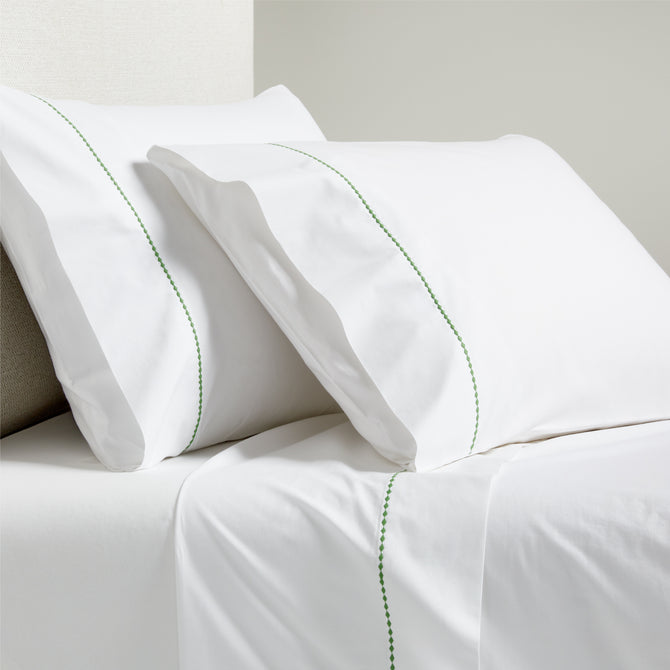 Bold and classic, our Italian Percale Green Diamond Collection takes a cue from the bedding we found in the finest European boutiques and hotels. The Green Diamond Percale Sheet Set is cool and crisp, softens with wash and use, and is the perfect way to tuck into luxury every night. It is woven from extra-long staple cotton in a 310-thread-count percale. The tailoring and green diamond detail in a sophisticated color palette make this a versatile collection that layers easily with other bedding and interior style.