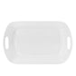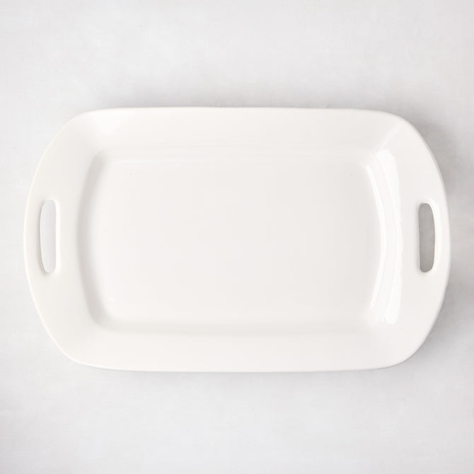 Exclusively Hudson Grace. Handmade of high-fired earthenware and a thick white glaze finish, our large handled platter is distinguished by its elegant and functional handles.