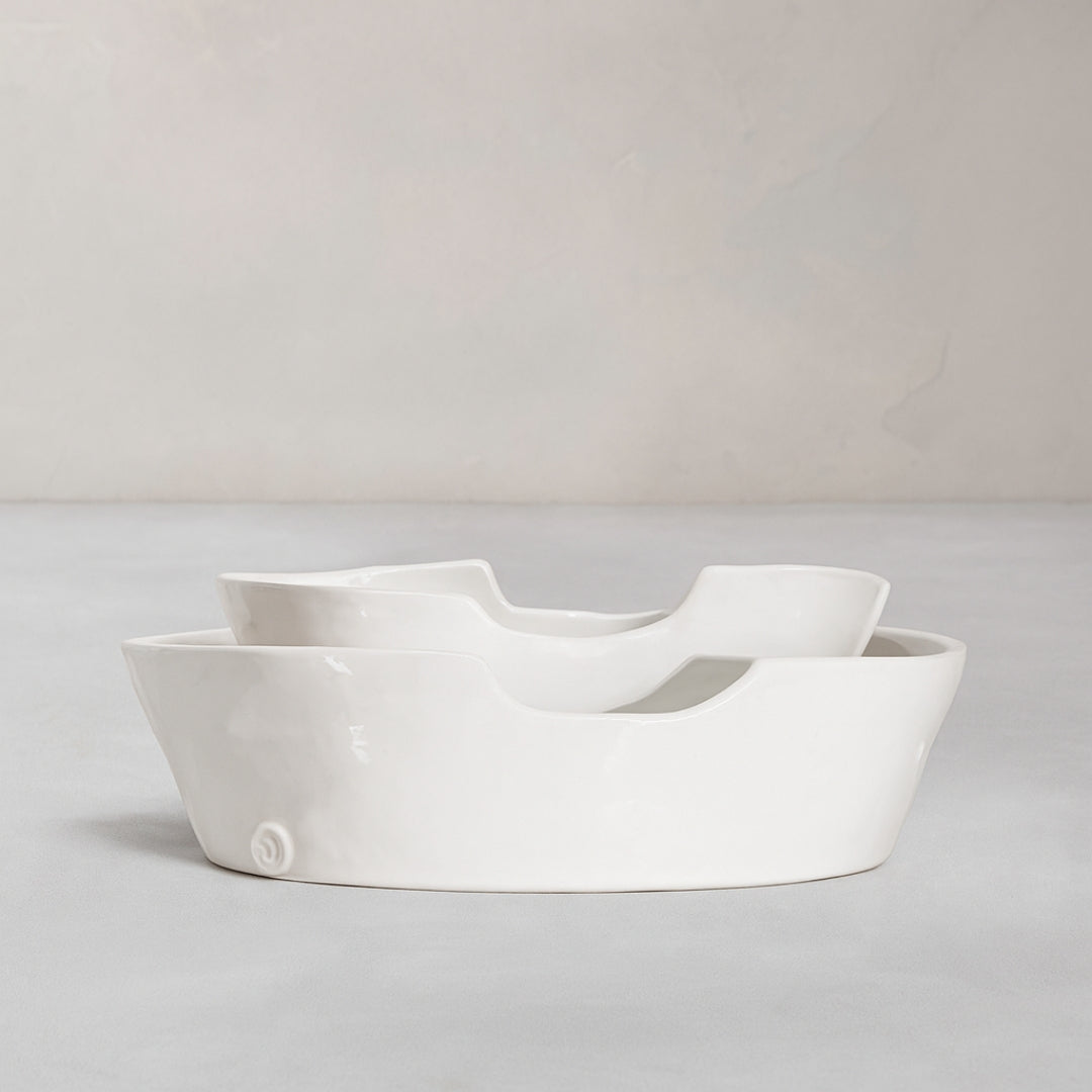 Made in Peru, each piece in the Montes Doggett line is handmade from high quality clay that is shaped and fired for durability. The natural materials and white glaze make every piece lead-free, microwave, dishwasher, and oven safe. Designed to embrace organic shapes and textures, these pieces are made to be used. From food storage and serving to decoration, each piece is as stylish as it is functional.