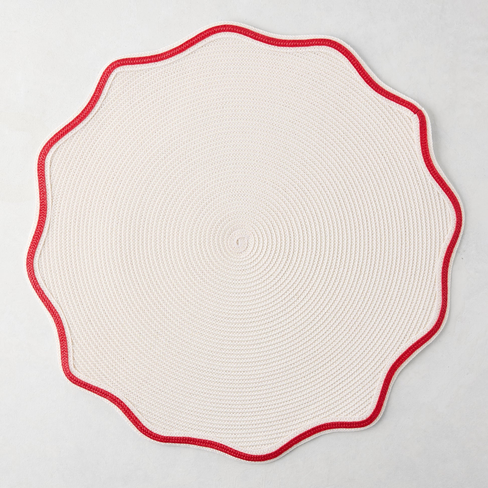 Bring a simple hint of color to your table with the Holiday Red Scalloped Edge Placemat. Understated yet unique, this placemat boasts an off-white base with a simple red piped edge that is perfect for the holiday season. Made from woven nylon and finished by hand, this placemat is perfect for both indoor and outdoor hosting.