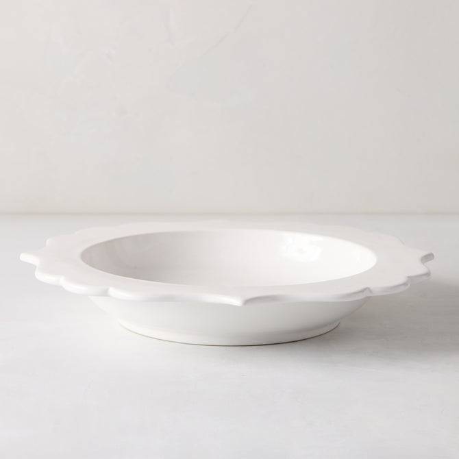 The sculptural detail of our Lungarno Ceramic Soup Bowl evokes the look of an antique heirloom. Beautiful for entertaining yet casual enough for everyday use, this bowl will grace your table in style when serving soups or salads. Crafted from ceramic and finished in our signature white glaze, this design effortlessly matches our other signature dinnerware and serveware collections. Add one to your existing dinnerware collection for a pop of detail, or display the whole set for a beautiful silhouette.