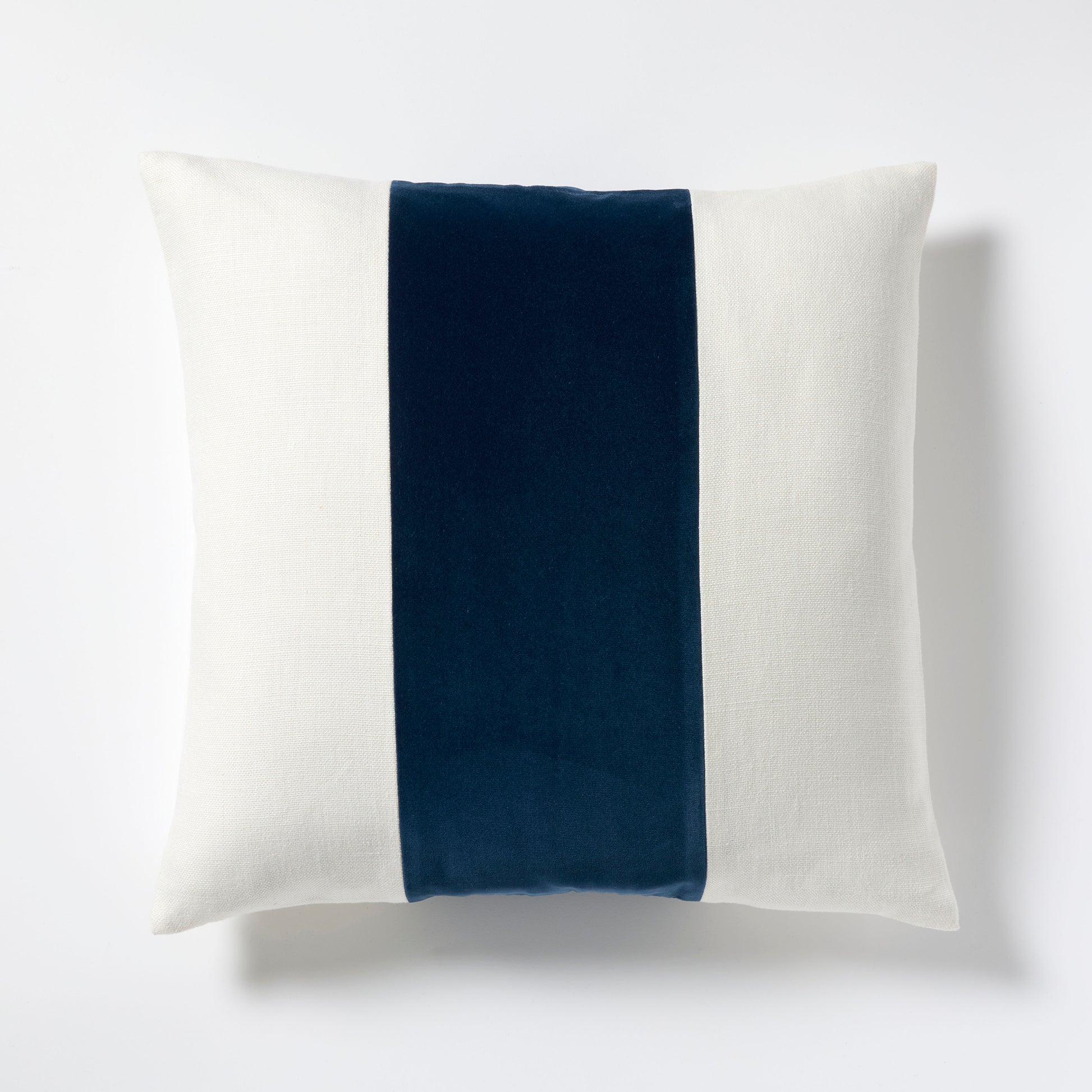 The Wide Velvet and Linen Stripe Pillow is custom made exclusively for Hudson Grace. Made from cream Belgian Linen and Midnight Blue cotton Velvet, these pillows are stuffed with down feather to be the perfect addition to your home.