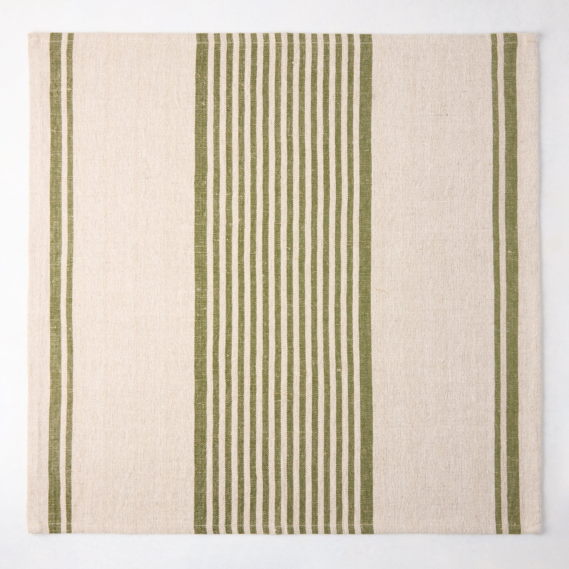 Inspired by boat interiors, the Natural Green Boat Stripe Napkin adds texture and style to any tablescape. Woven from washed cotton and linen, the green stripes overlay a beige base to create a subtle, modern look that is perfect for any occasion.
