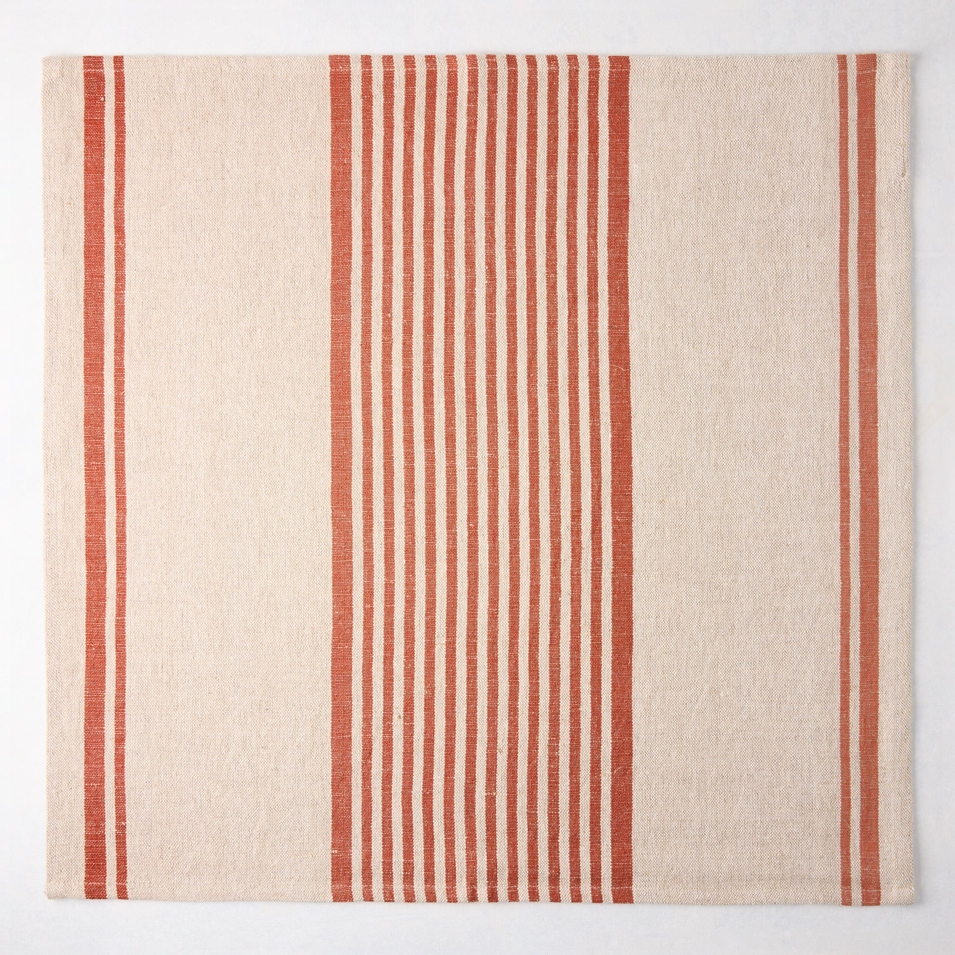 Inspired by boat interiors, the Natural Spice Orange Boat Stripe Napkin adds texture and style to any tablescape. Woven from washed cotton and linen, the orange stripes overlay a beige base to create a subtle, modern look that is perfect for any occasion.