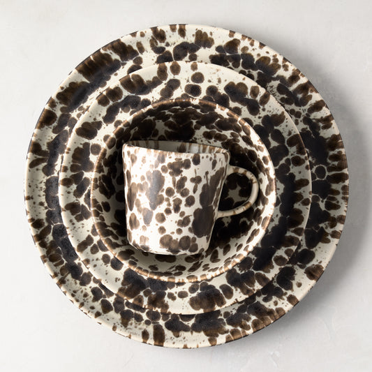 Inspired by the historic splatterware technique, known for its spontaneous and expressive paint patterns, we’ve updated this classic art form with a fresh colorway that complements today’s aesthetic. The dark brown splashes against a creamy ivory background create a dynamic and inviting contrast, merging the old with the new.