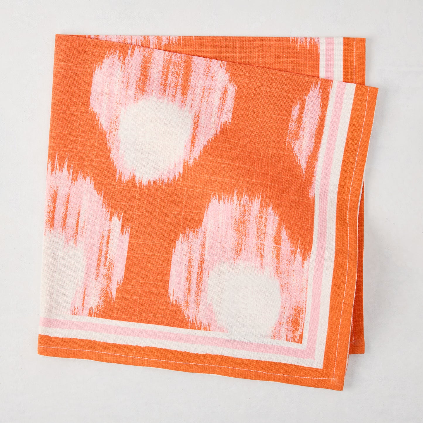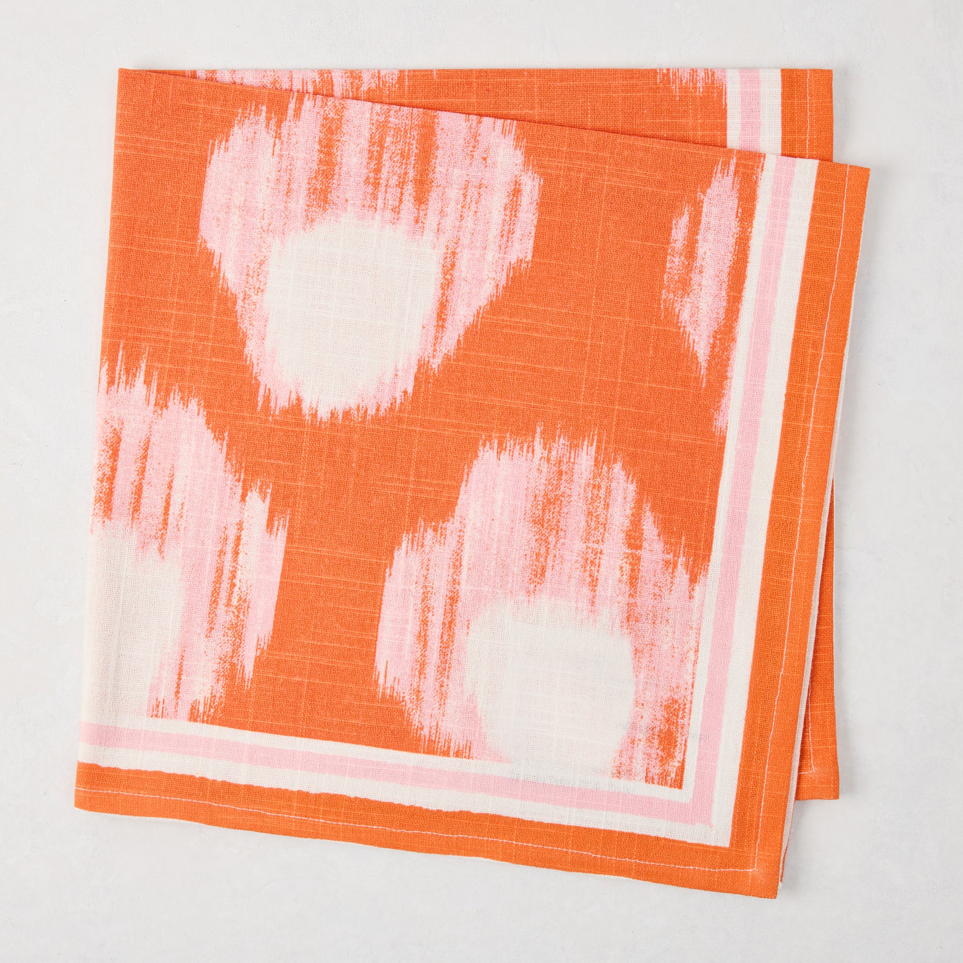 Add a pop of pattern with the Bukhara Ikat Printed Napkin in Orange—a bold print softened by the blurred edges of a classic ikat. Made from 100% cotton slub, it has a relaxed, textured feel with lasting durability. This ikat napkin will layer perfectly with other linens in the PD x HG collection, or with our signature HG Linens.