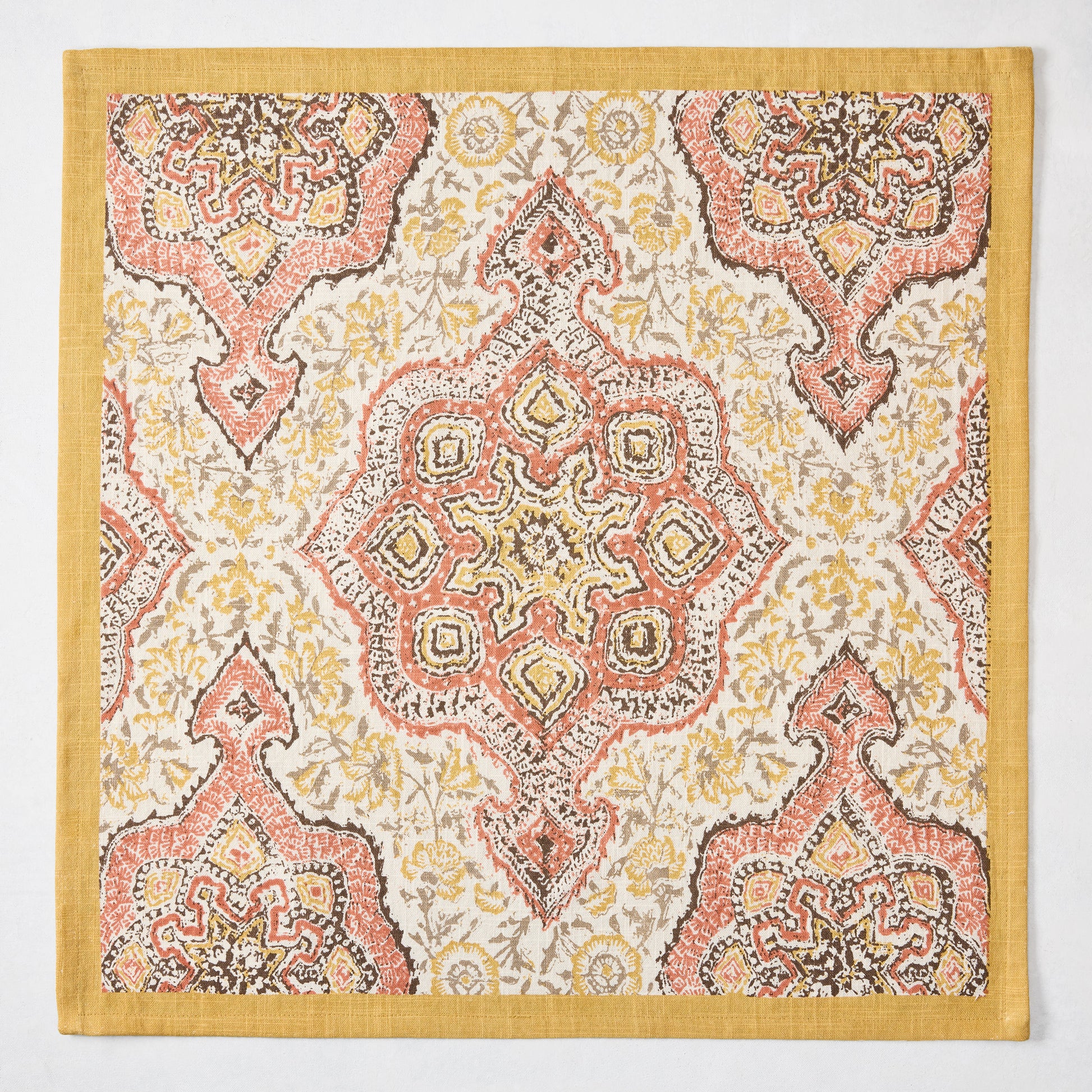 Inspired by painted ceilings in an Indian palace of the same name, the Gold and Orange Deeg Printed Napkin features a pattern that is lush and dense, yet delicate at the same time. Finished with a yellow border detail, this napkin will add beauty to your table. Made from 100% cotton slub, it offers a relaxed, textured feel with lasting durability. This beautiful napkin will layer perfectly with other linens in the PD x HG collection, or with our signature HG Linens.