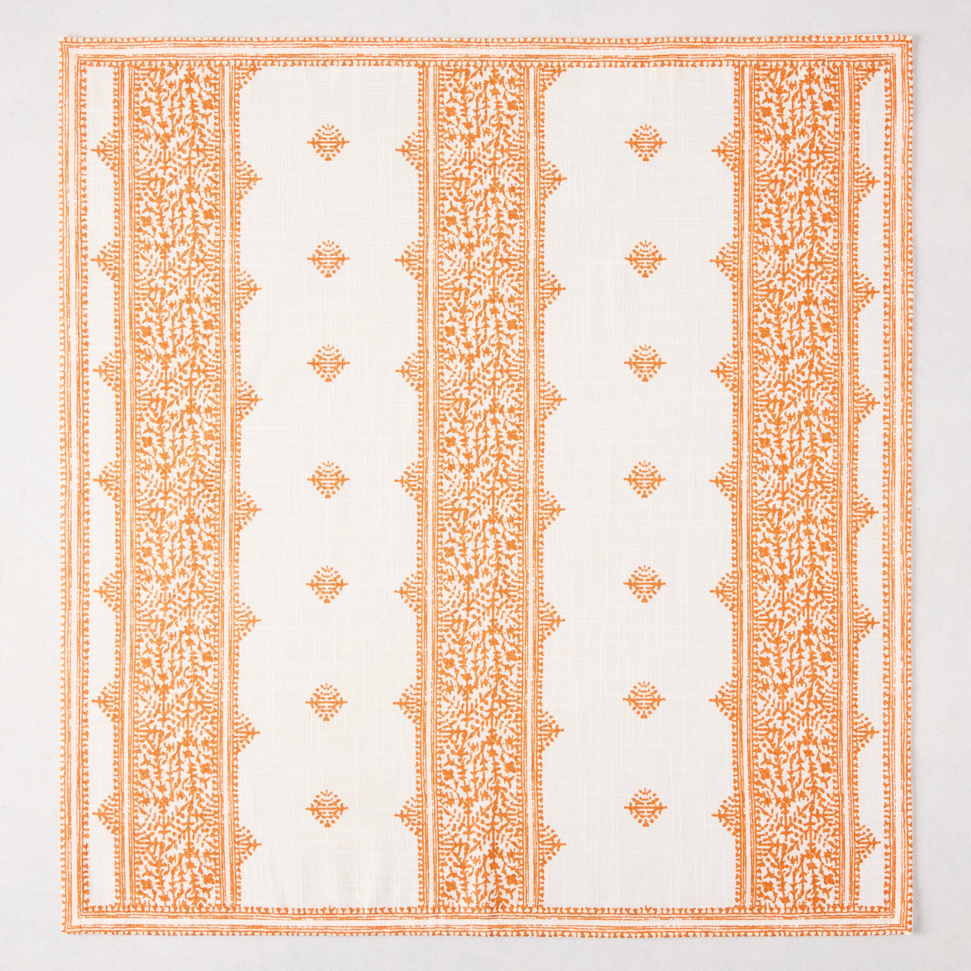 Details with personality. The Orange Fez Printed Napkin features an intricate pattern inspired by vintage embroidery. With alternating stripes and flourishes in between, the Fez print adds a playful layer to your table. Made from 100% cotton slub, it offers a relaxed, textured feel with the durability to handle everyday dining or special occasions. Perfect for layering into any tablescape—adding a touch of the unexpected.
