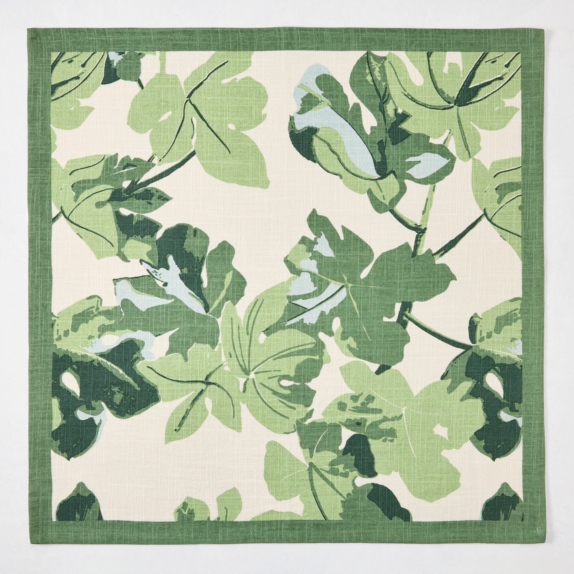 Inspired by fig groves in Spain, the Fig Printed Napkin captures the memories of a European summer. Featuring bold green fig leaves against an ivory, natural toned base this iconic print brings a colorful touch to your table. Made from 100% cotton slub, it offers a relaxed, textured feel with the durability to handle everyday dining or special occasions. With a green border, this napkin will layer perfectly with other linens in the PD x HG collection, or with our signature HG Linens.