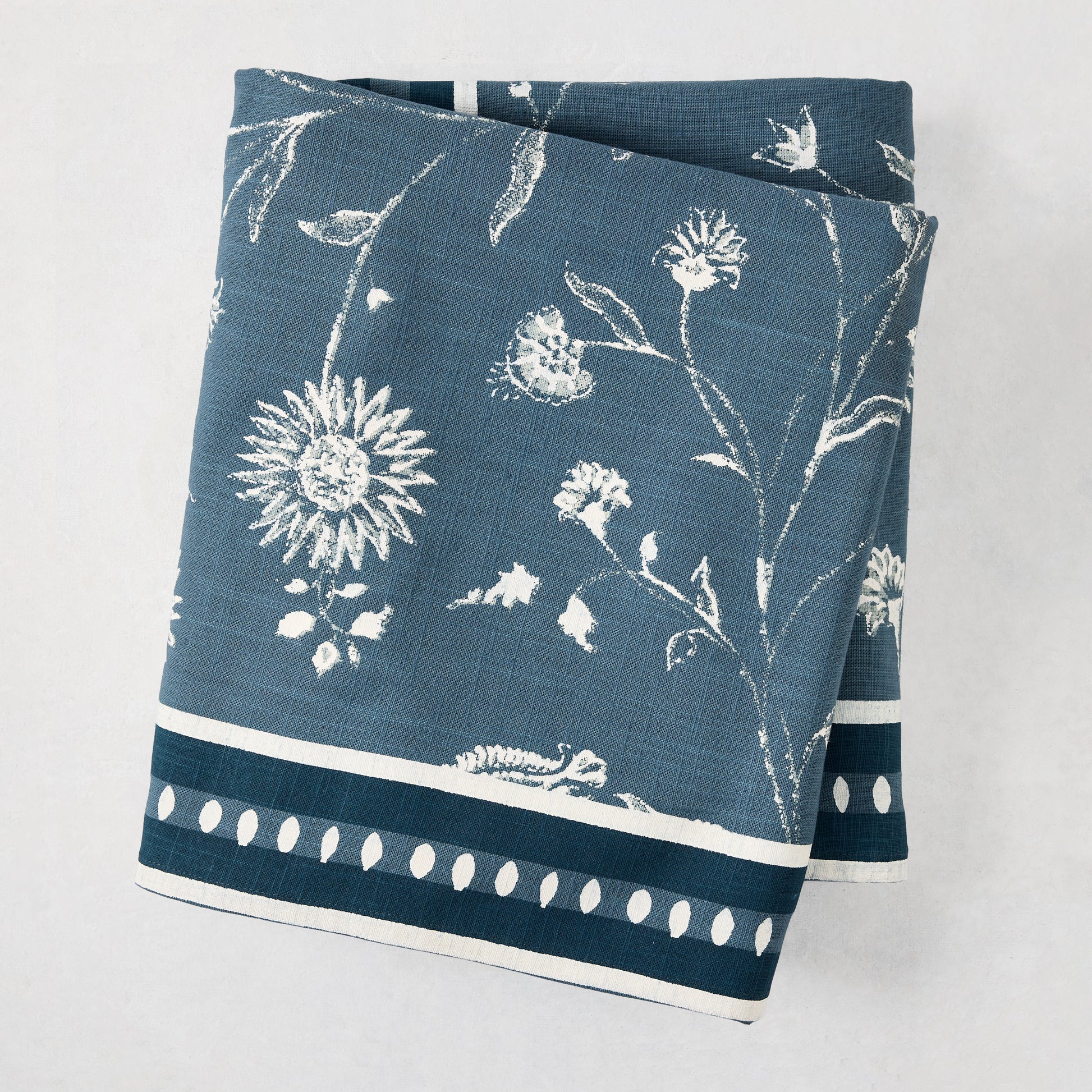 Florals for the ages. The Indigo Blue Indian Chintz Printed Tablecloth is a rambling floral whose pattern is sweet and sophisticated. Paired with a border inspired by an antique rug from Peter’s personal collection, this tablecloth will bring beauty to your table. Made from 100% cotton slub, it offers a relaxed, textured feel with lasting durability. This floral tablecloth will layer perfectly with other linens in the PD x HG collection, or with our signature HG Linens.