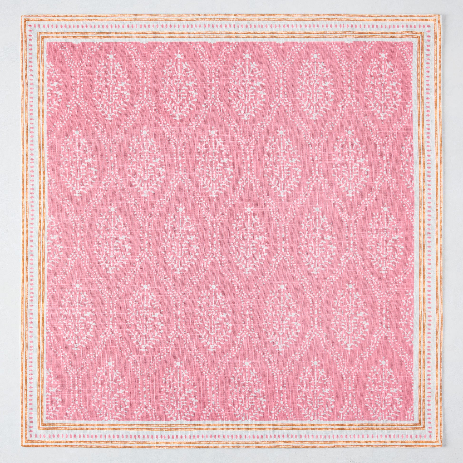 Inspired by a block print Peter found in India, the Pink Jaali Printed Napkin is his graphic take on a floral pattern. Paired with an orange border inspired by an antique rug from Peter’s personal collection, this napkin will bring style to your table. Made from 100% cotton slub, it offers a relaxed, textured feel with lasting durability. Perfect for layering into any tablescape—adding a touch of the unexpected.