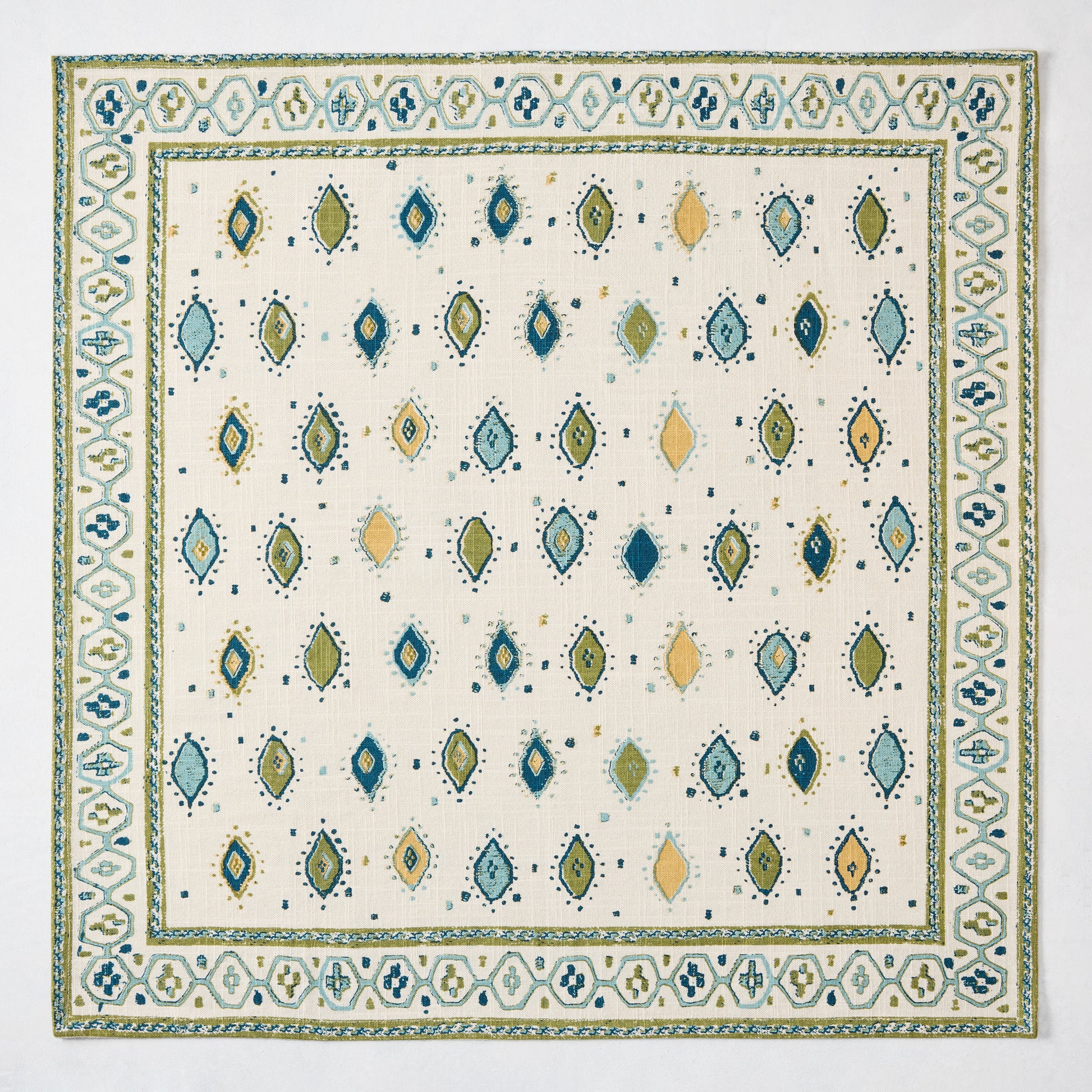 The Green Oona Printed Napkin features a tribal motif with great rhythm, originally inspired by the back of a rug. Characterized by the tonal green print and bold border, this fashion-forward pattern is printed on an ivory, natural toned base that will add a playful layer to your table. Made from 100% cotton slub, it offers a relaxed, textured feel with lasting durability. This napkin will layer perfectly with other linens in the PD x HG collection, or with our signature HG Linens.