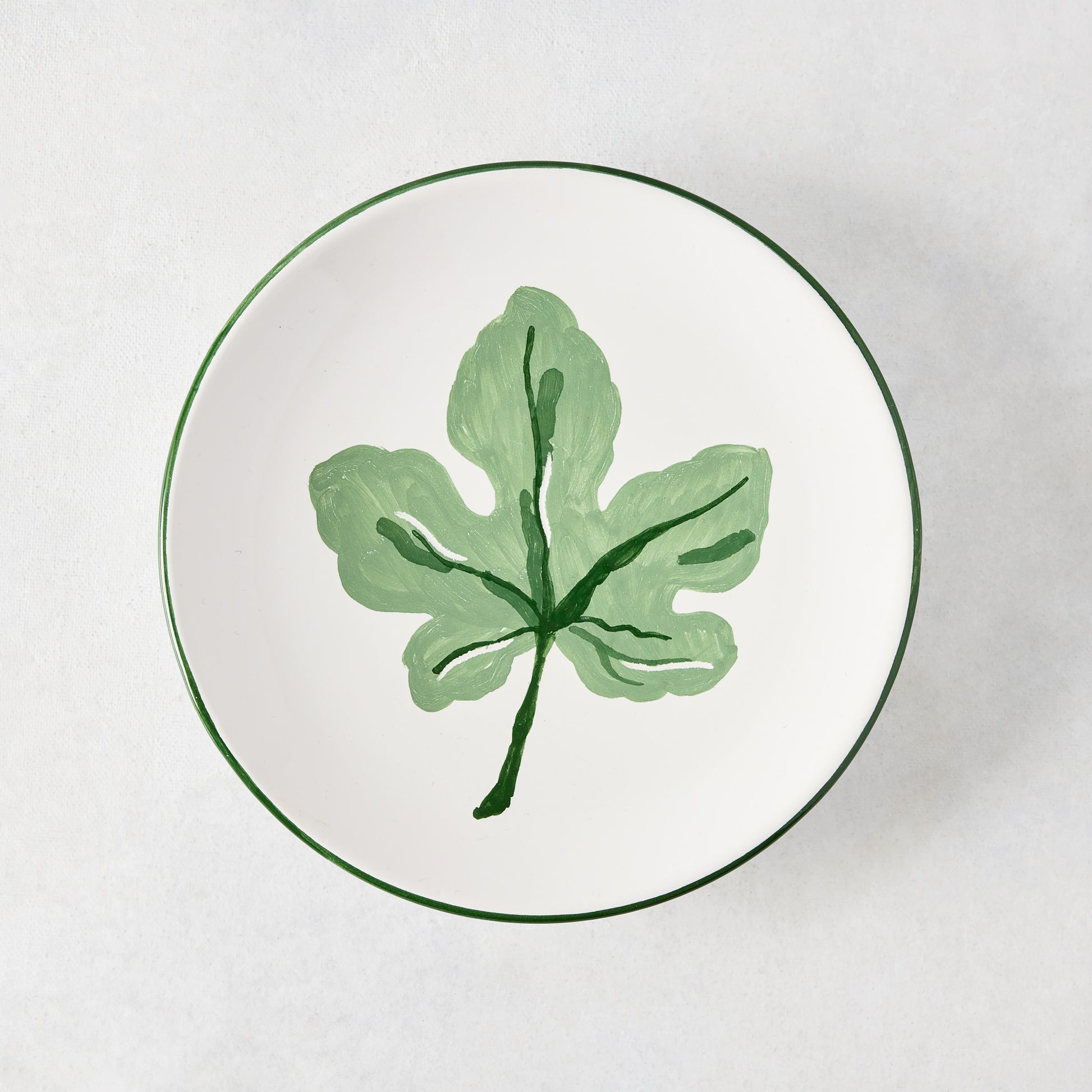 Made in Italy, each Green Fig Appetizer Plate is unique, and designed for mixing and matching. Inspired by fig groves in Spain, the hand-painted plate highlights a single green fig leaf with a green border detail, capturing the memories of a European summer. Timeless, yet full of character, this plate is perfect for layering into any tablescape—adding a touch of the unexpected.