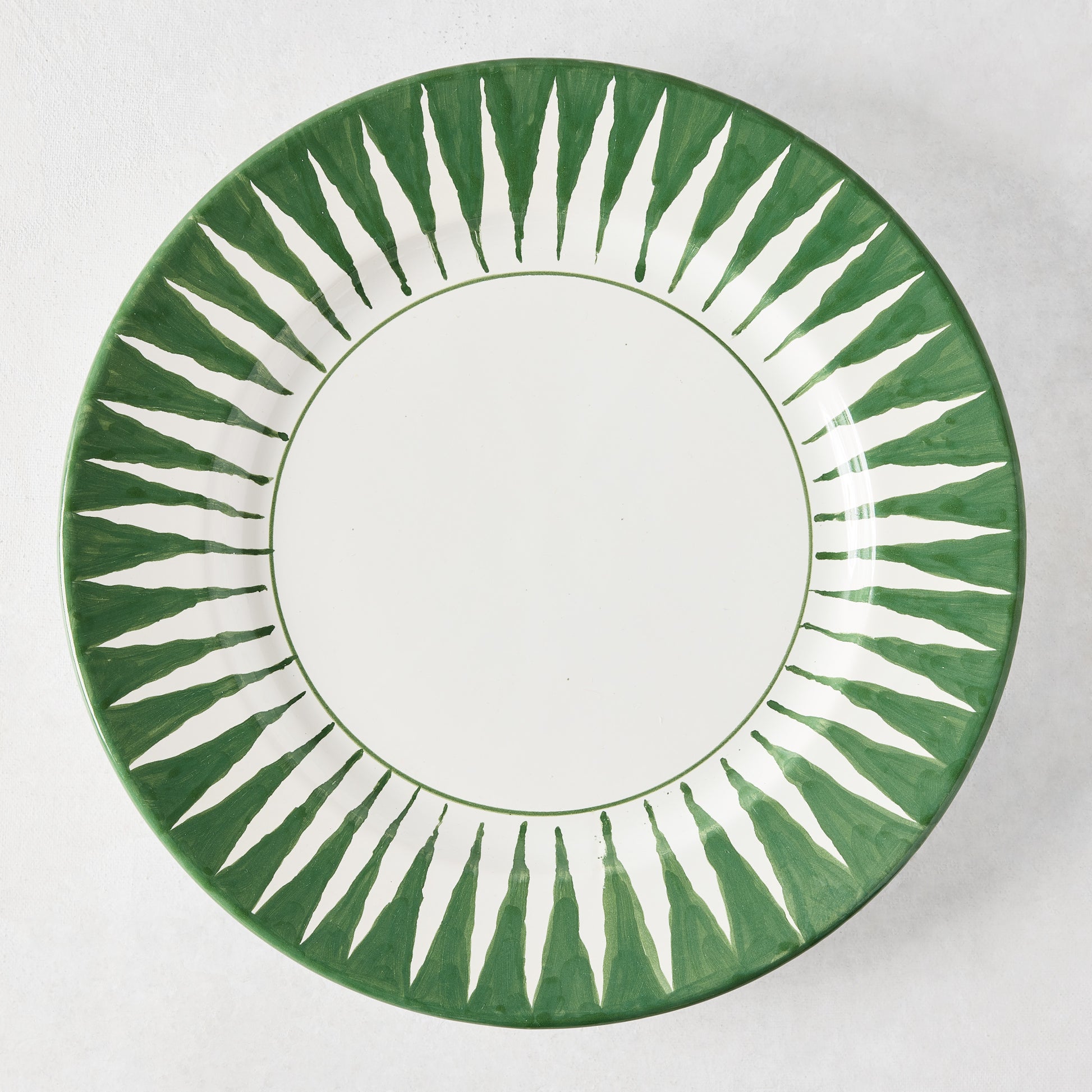 Made in Italy, each dinner plate is hand-painted, unique, and designed for mixing and matching. This new Dark Green Hand-Painted Sunburst Dinner Plate is based on a classic handwoven ikat stripe, and its signature blurred edges. This plate is timeless, yet full of character. Perfect for layering into any tablescape—adding a touch of the unexpected.
