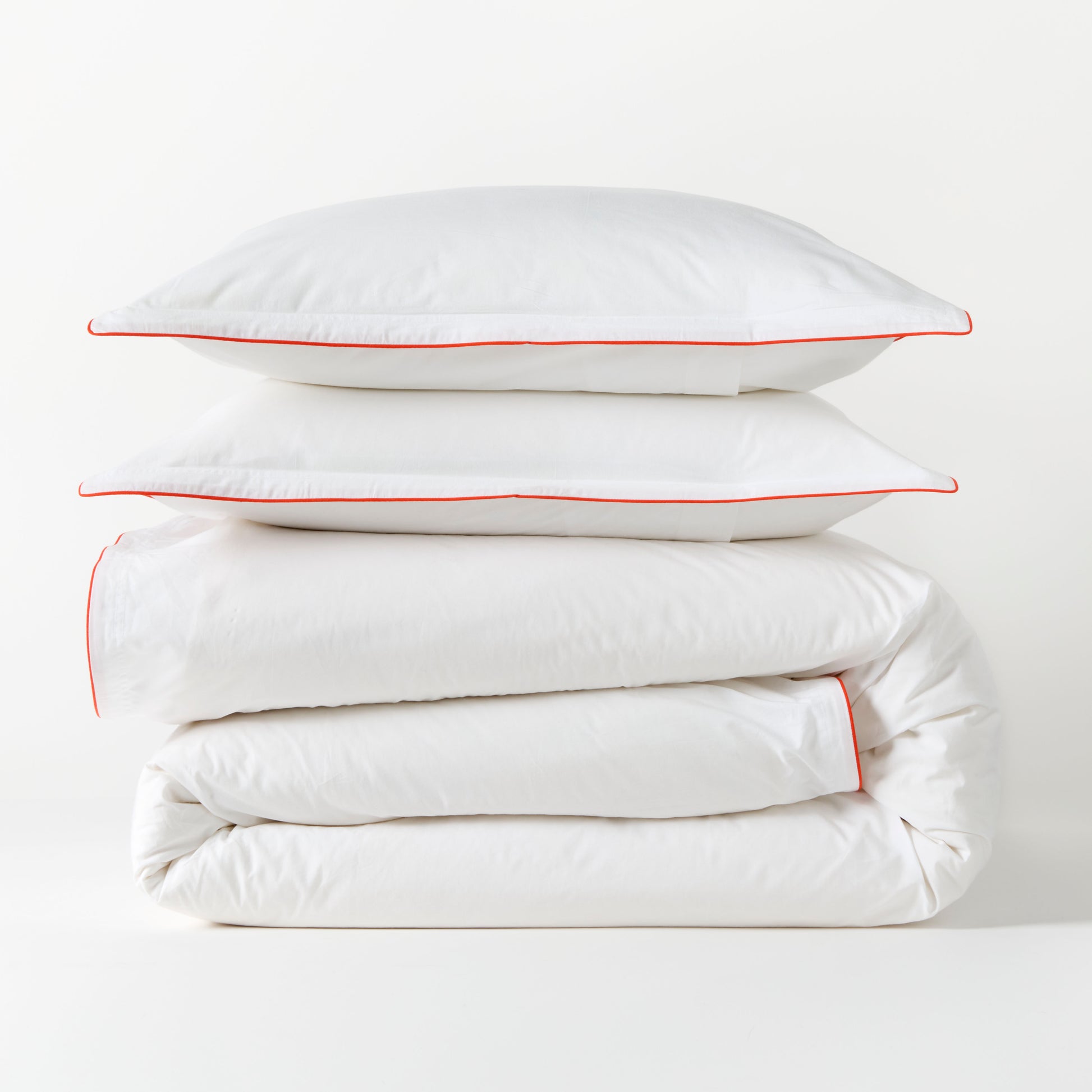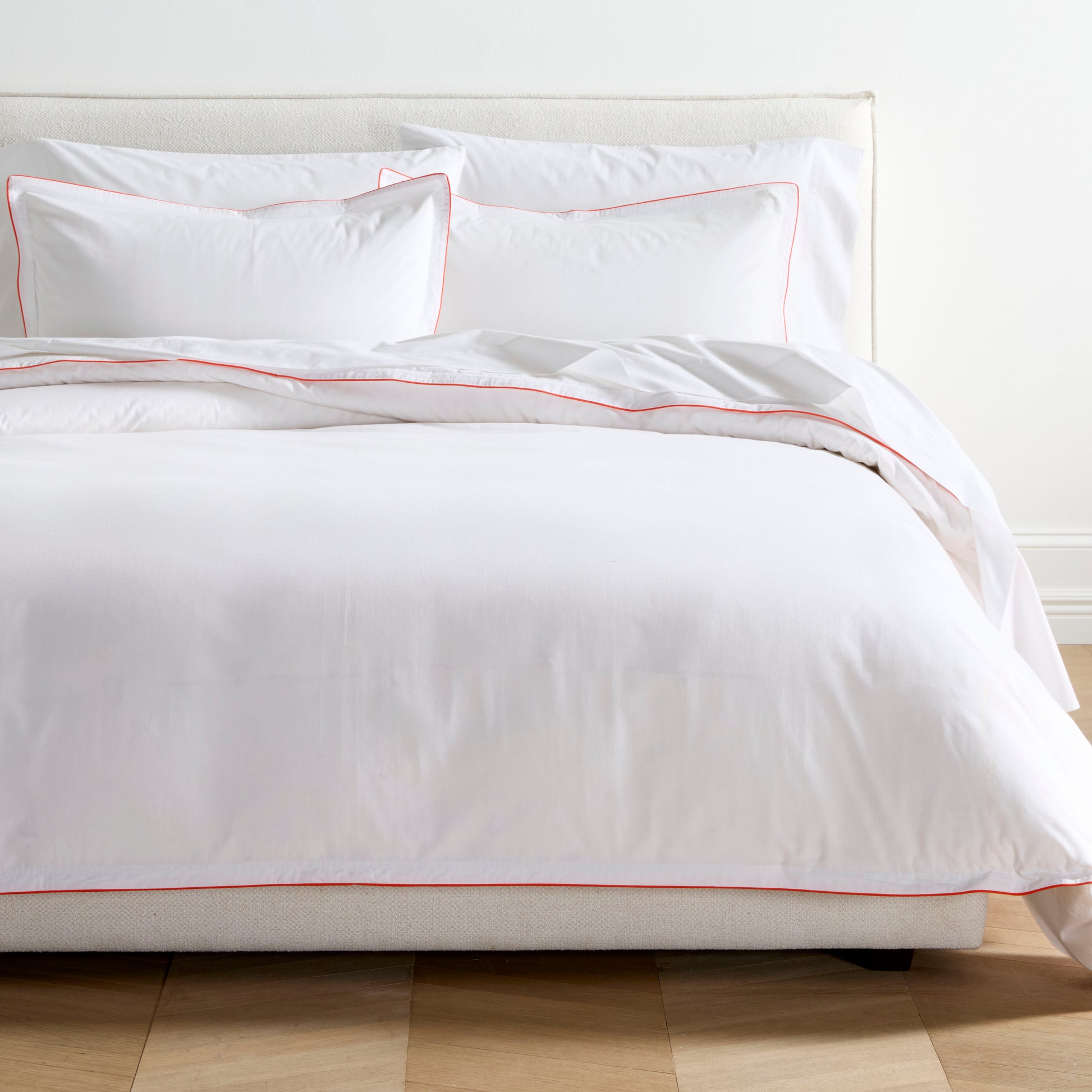 A touch of color and just the right amount of detail. The Orange Piped Percale Duvet and Sham Set is accented with delicate orange piping and subtle double-stitch detailing. This bedding brings crisp, tailored casual to your bed. Made in Portugal from 100% cotton this super soft, 310-thread-count percale is meant to be your new everyday.