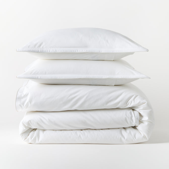 A touch of color and just the right amount of detail. The White Piped Percale Duvet and Sham Set is accented with delicate white piping and subtle double-stitch detailing. This bedding brings crisp, tailored casual to your bed. Made in Portugal from 100% cotton this super soft, 310-thread-count percale is meant to be your new everyday.