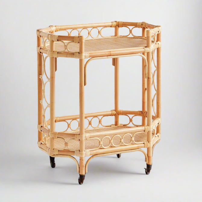 Introducing the sleek and chic Raelyn Bar Cart in Natural. With multiple shelves and room for storage, you'll have plenty of space to store your favorite cocktails, glassware, and bar tools. The handmade rattan frame and dark wood shelves give the Raelyn Bar Cart a modern and sophisticated look that will complement any decor style. Plus, the smooth-rolling casters make it a breeze to move the cart around your space, so you can serve up your favorite cocktails wherever the party takes you.
