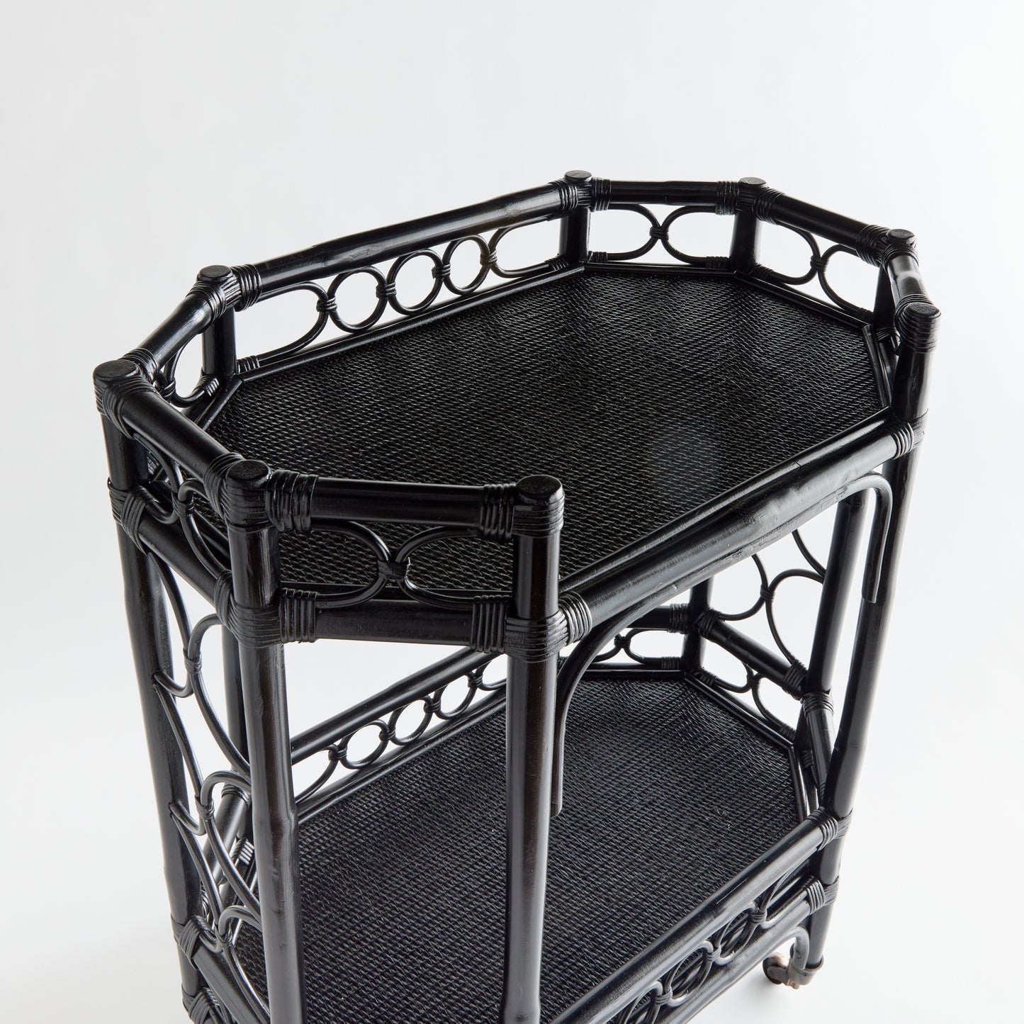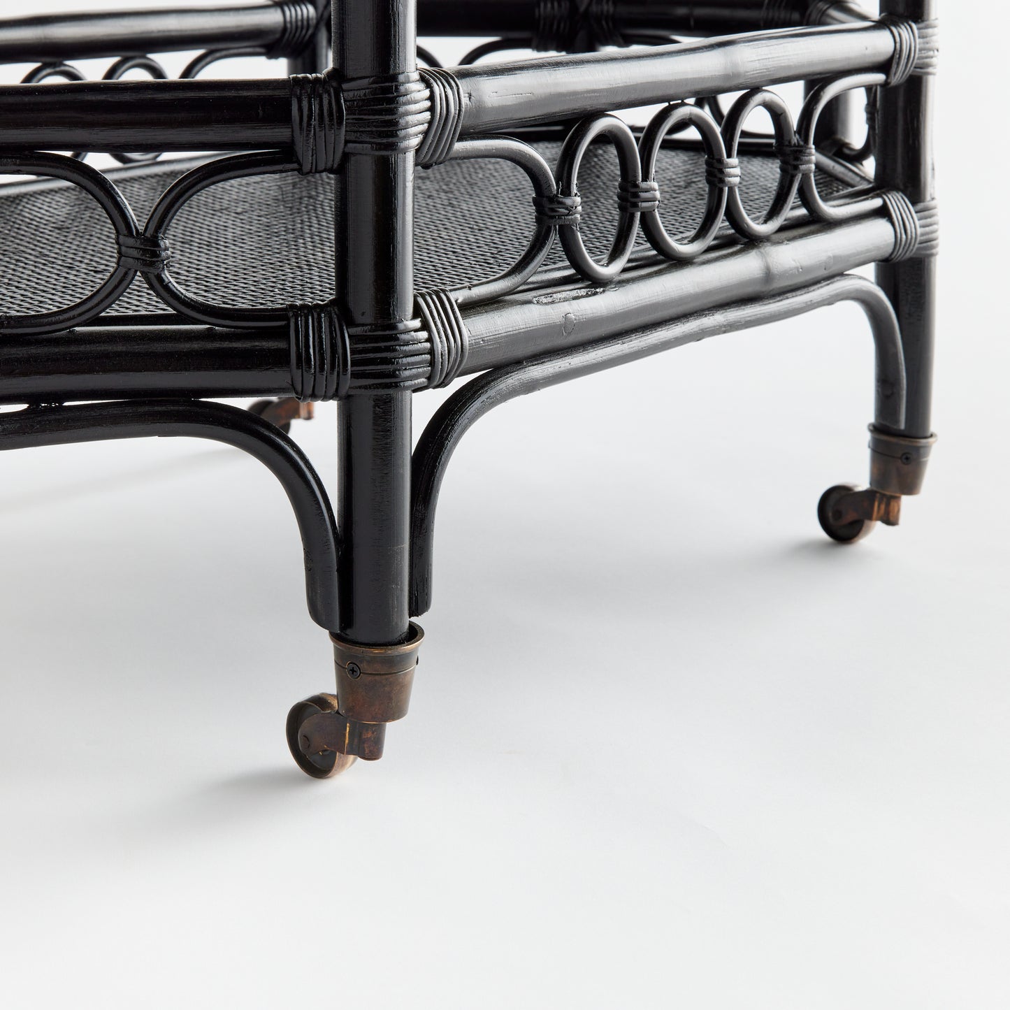 Introducing the sleek and chic Raelyn Bar Cart in Black. With multiple shelves and room for storage, you'll have plenty of space to store your favorite cocktails, glassware, and bar tools. The handmade black rattan frame and dark wood shelves give the Raelyn Bar Cart a modern and sophisticated look that will complement any decor style. Plus, the smooth-rolling casters make it a breeze to move the cart around your space, so you can serve up your favorite cocktails wherever the party takes you.