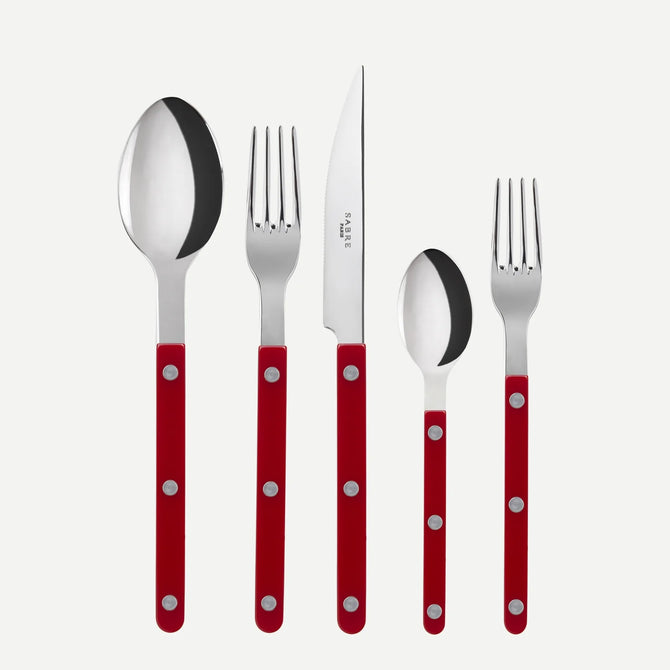 Our Bistro Flatware 5-Piece Set is crafted in France with the finest attention to detail. Each place setting includes a dinner knife, dinner fork, soup spoon, salad fork, and teaspoon – all the essentials for enjoying a memorable meal. The stainless steel 18/10 construction ensures durability and a sleek, shiny finish. The acrylic handles provide a comfortable grip and a contemporary style, bringing a touch of Parisian charm to your table.