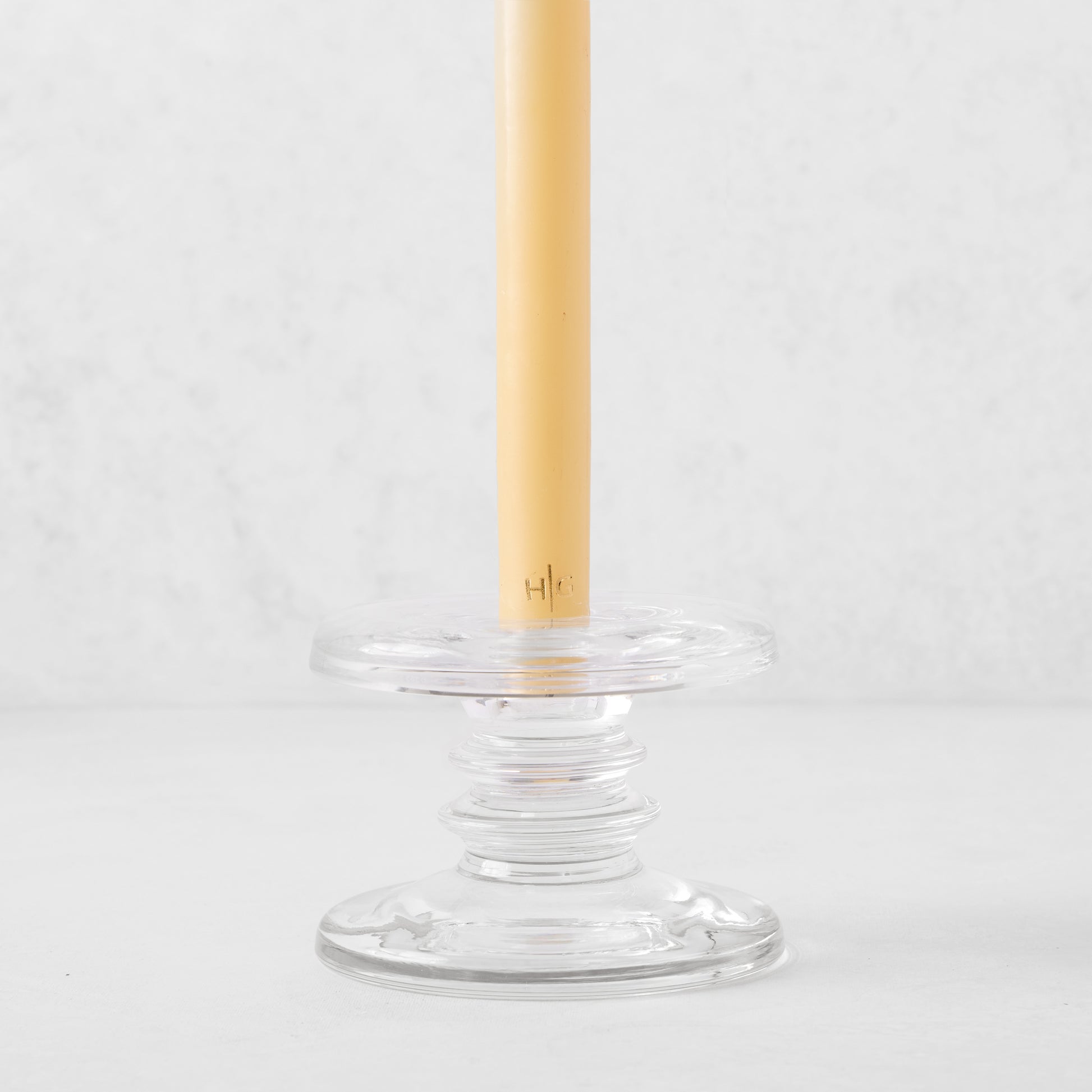 Bring simple elegance to your table with the Small Glass Single Candleholder. Handcrafted in Poland, this candlestick will look beautiful by itself, in a group, or mixed and match between the three sizes. The classic design features a wide top and base and ridges that add flair, and a hole that fits the HG 10" Taper Candle perfectly.