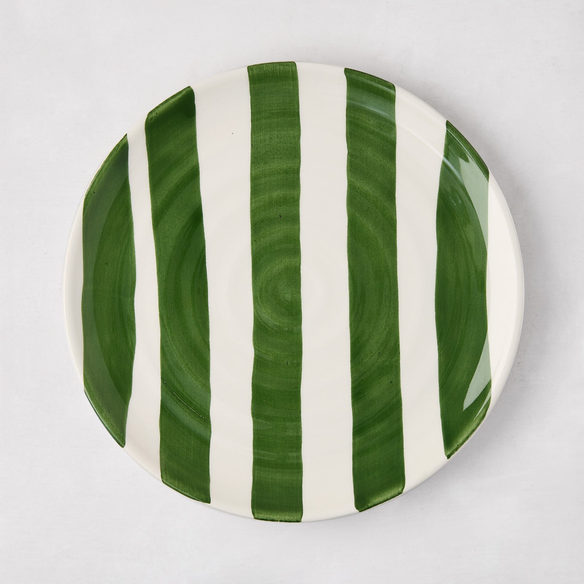 Handmade by artisans in Italy, each ceramic Green Striped Spiral Salad Plate is spun on a pottery wheel to create grooves and a unique silhouette that fits comfortably in your hands. The hand-painted green stripes will be a fun a whimsical addition to your summer table setting.