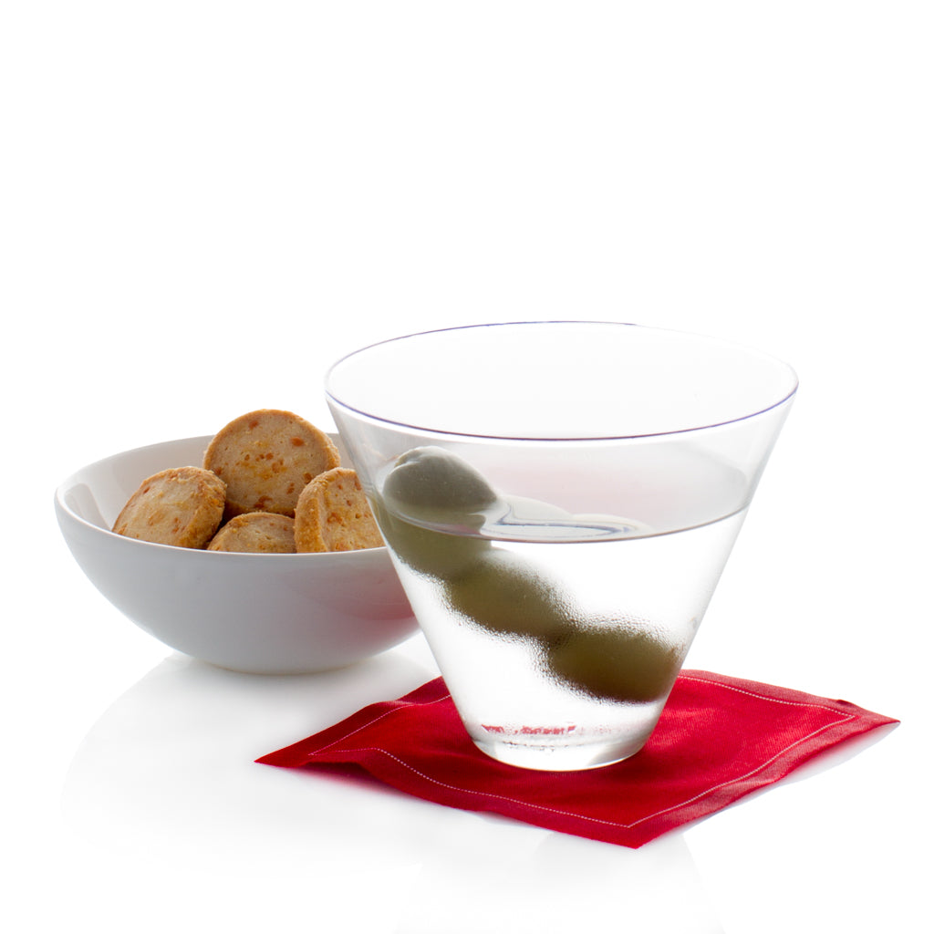 This Stemless Martini Glass has a wide brim that benefits the vodka and gin by exposing it to the air, allowing it to flourish with an aroma - A critical component that is a miss when served in a narrow glass. The steeply sloped sides prevent the cocktail's ingredients from separating and help support a pick of olives.