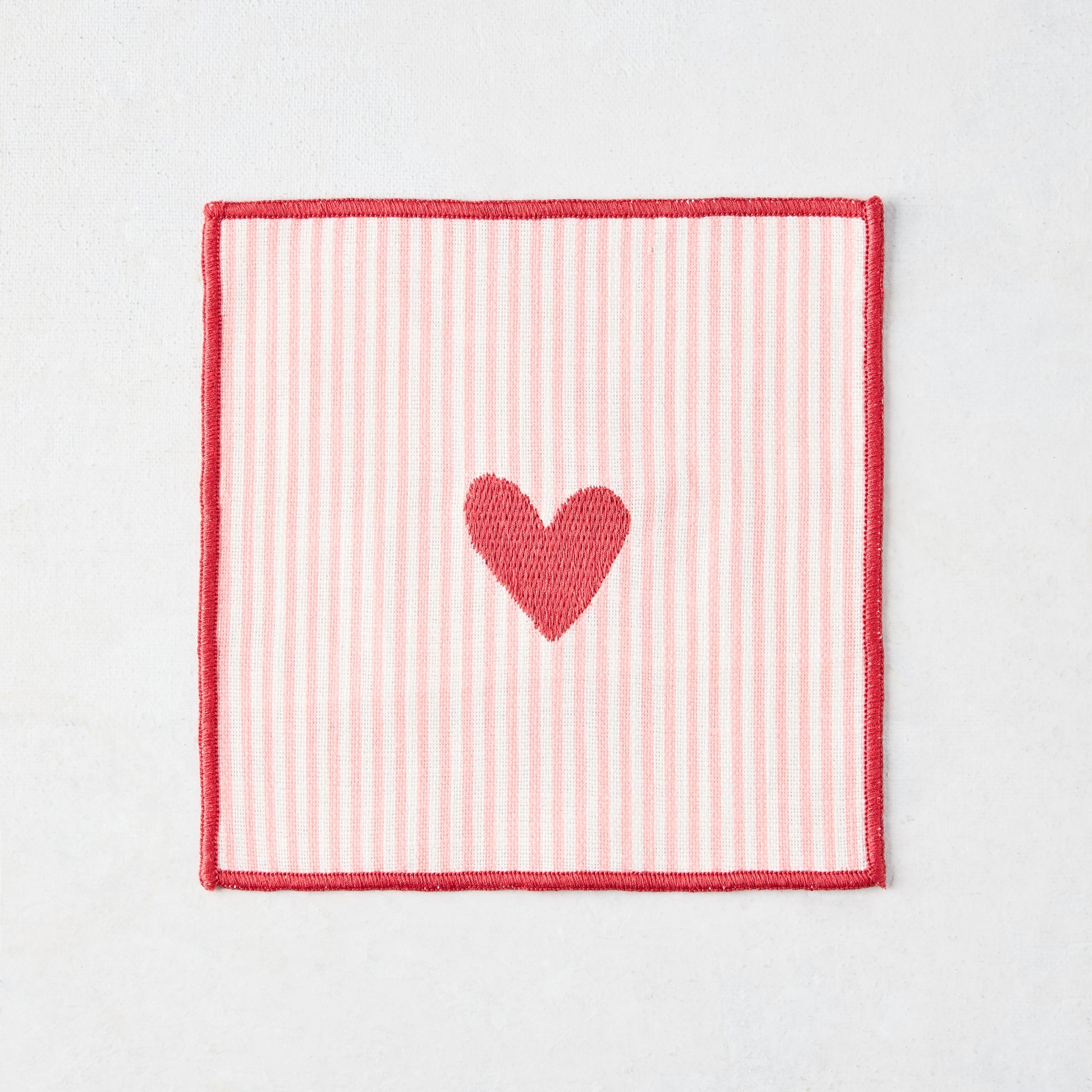 Add a fun Valentine's Day flare to your bar with the Embroidered Striped Heart Coasters. The four coasters feature a red embroidered heart and edge overlaying pale pink and white stripes, perfect for any gathering from Galentine's Day Brunch to a Valentine's Day dinner party. Made from cotton, these coasters are machine washable and can be used over and over again.